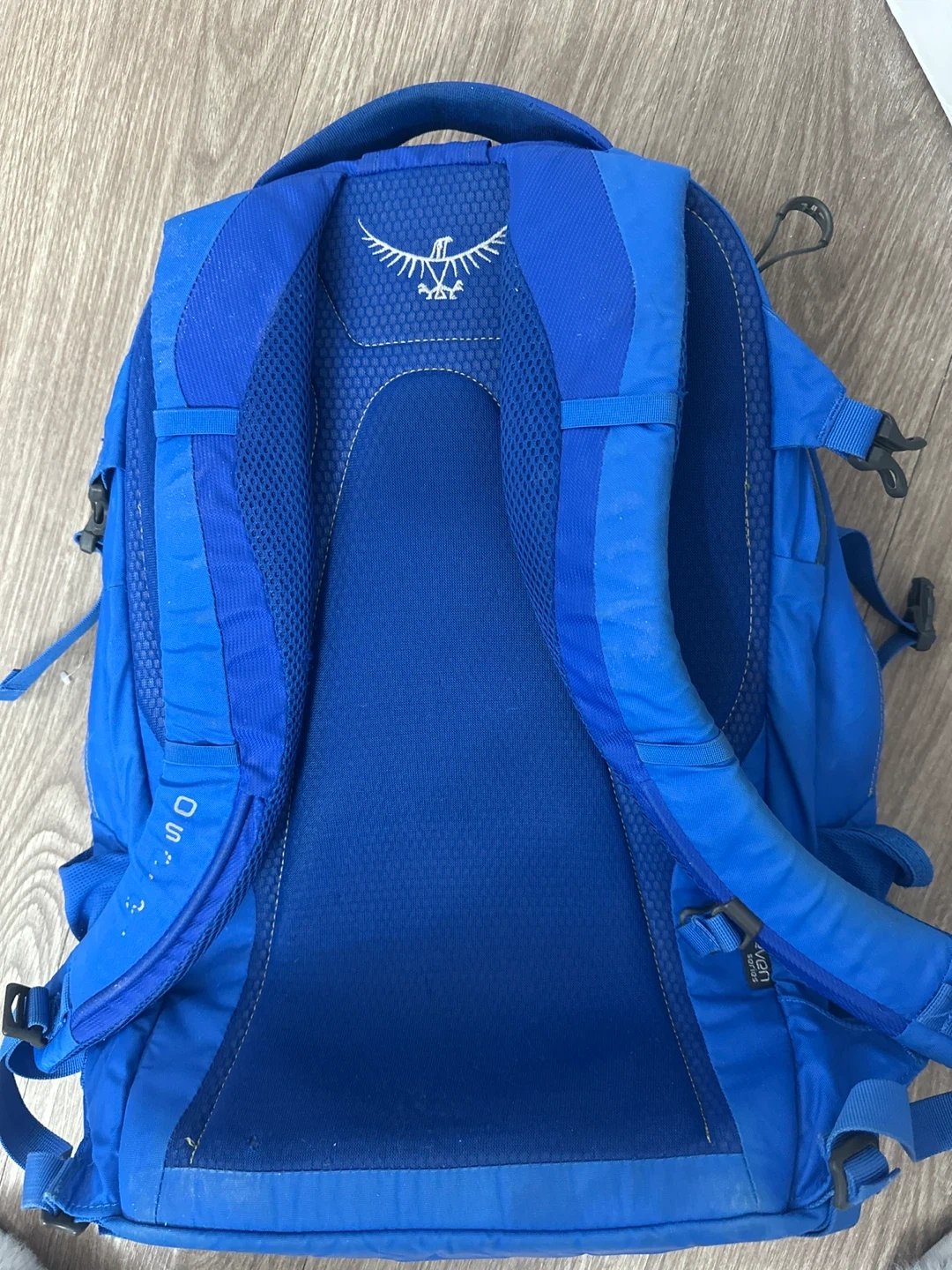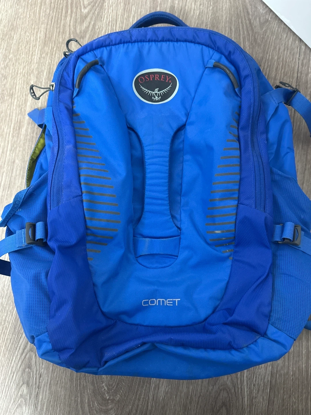 This is an Osprey Comet backpack in blue. It features multiple zippered compartments for storage. The padded straps make it comfortable for carrying.