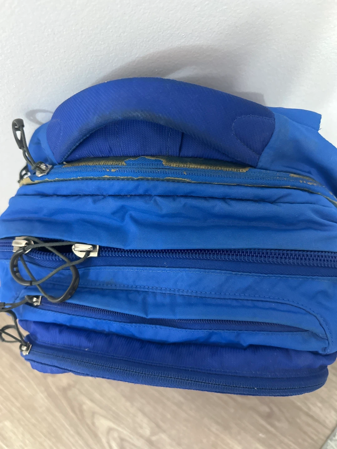 This is an Osprey Comet backpack in blue. It features multiple zippered compartments for storage. The padded straps make it comfortable for carrying.