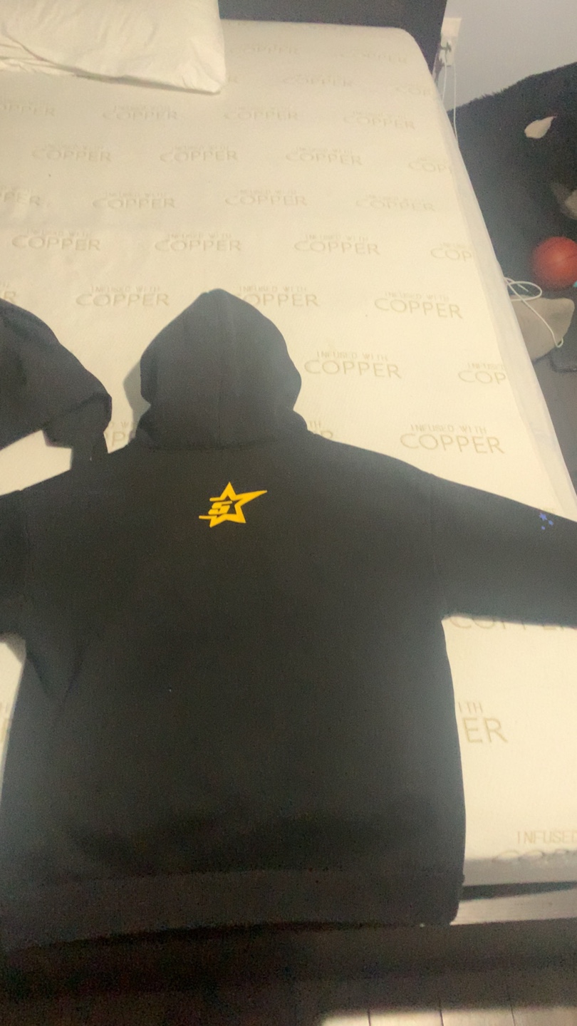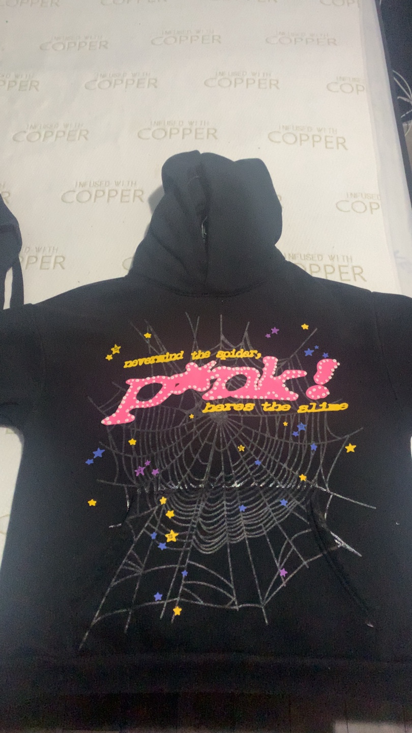 Black hoodie with "nevermind the spider pink! bores the slime" graphic on the front. It has a star logo on the back. Cotton material.