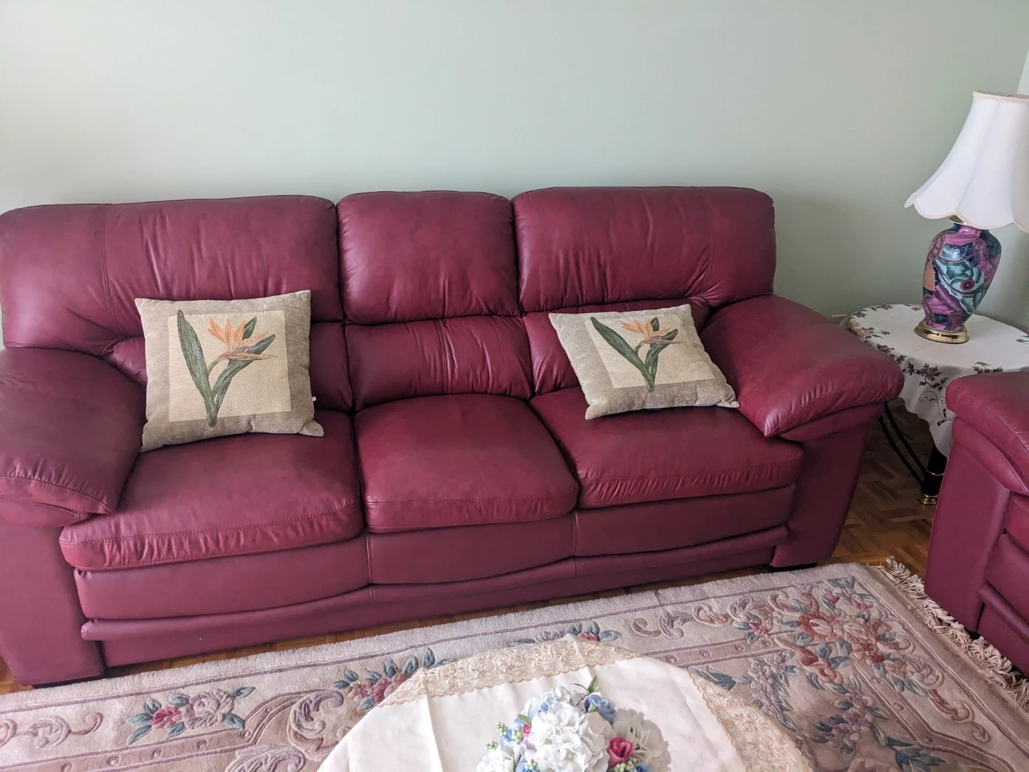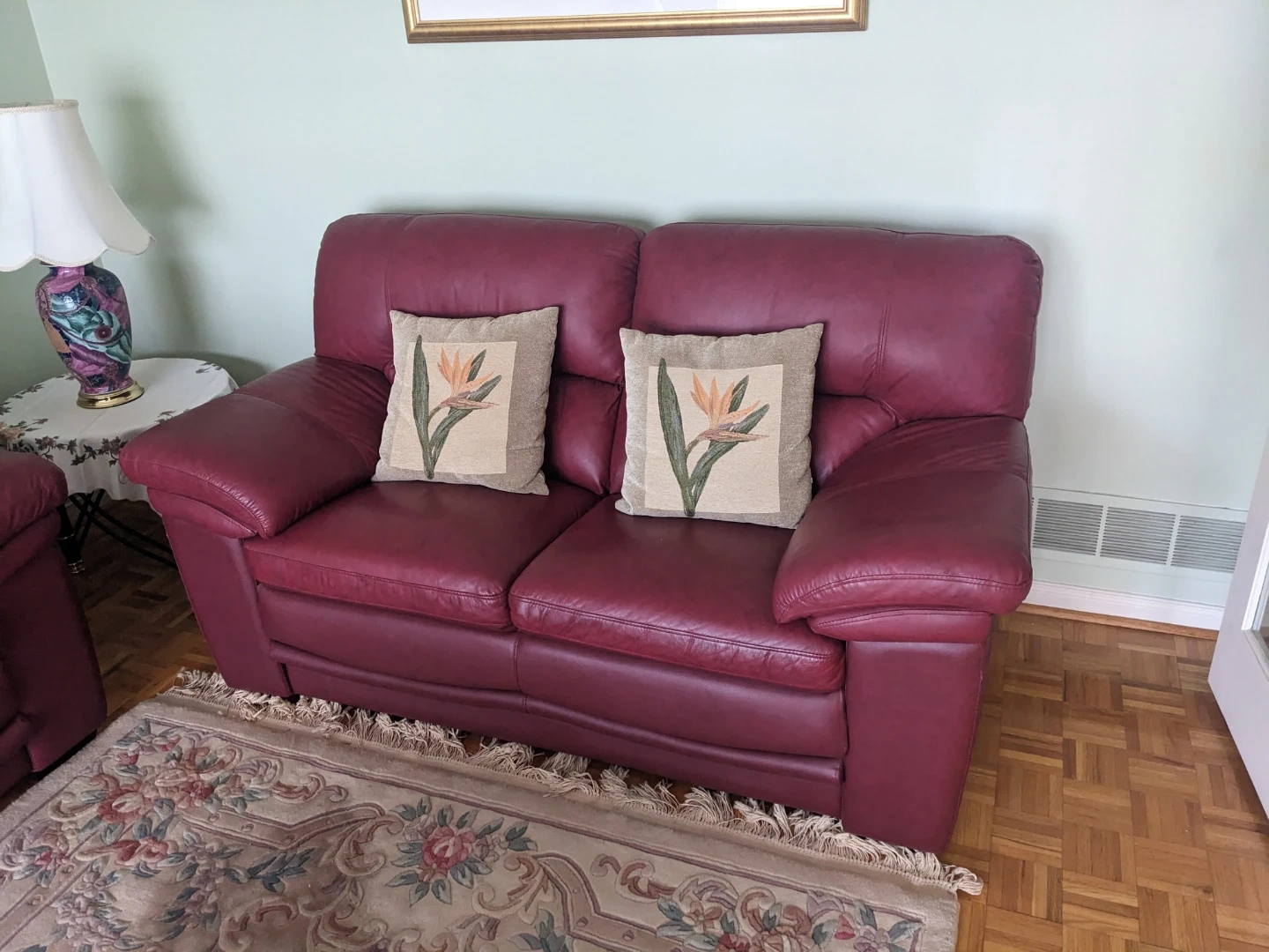 Comfortable like new burgundy leather couch and loveseat. Message for dimensions of each - can be sold as set or individual