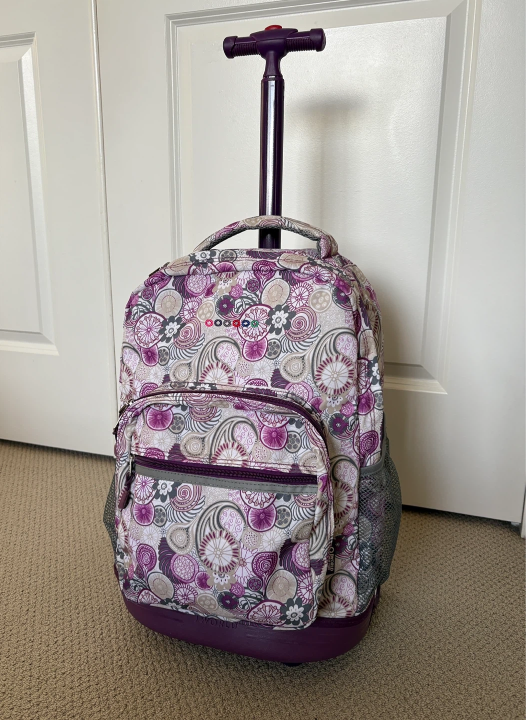 Rolling backpack in a purple floral pattern. It has a telescoping handle and wheels for easy transport, plus shoulder straps for carrying like a regular backpack. The size is about 48 cm x 30cm x 20cm