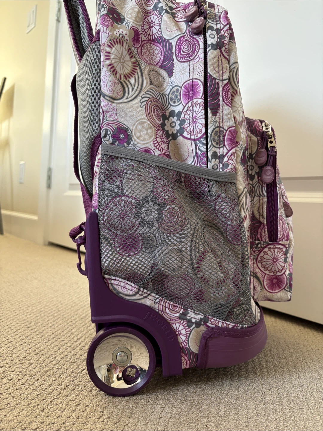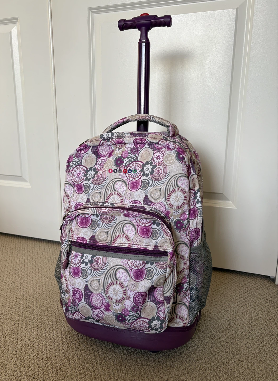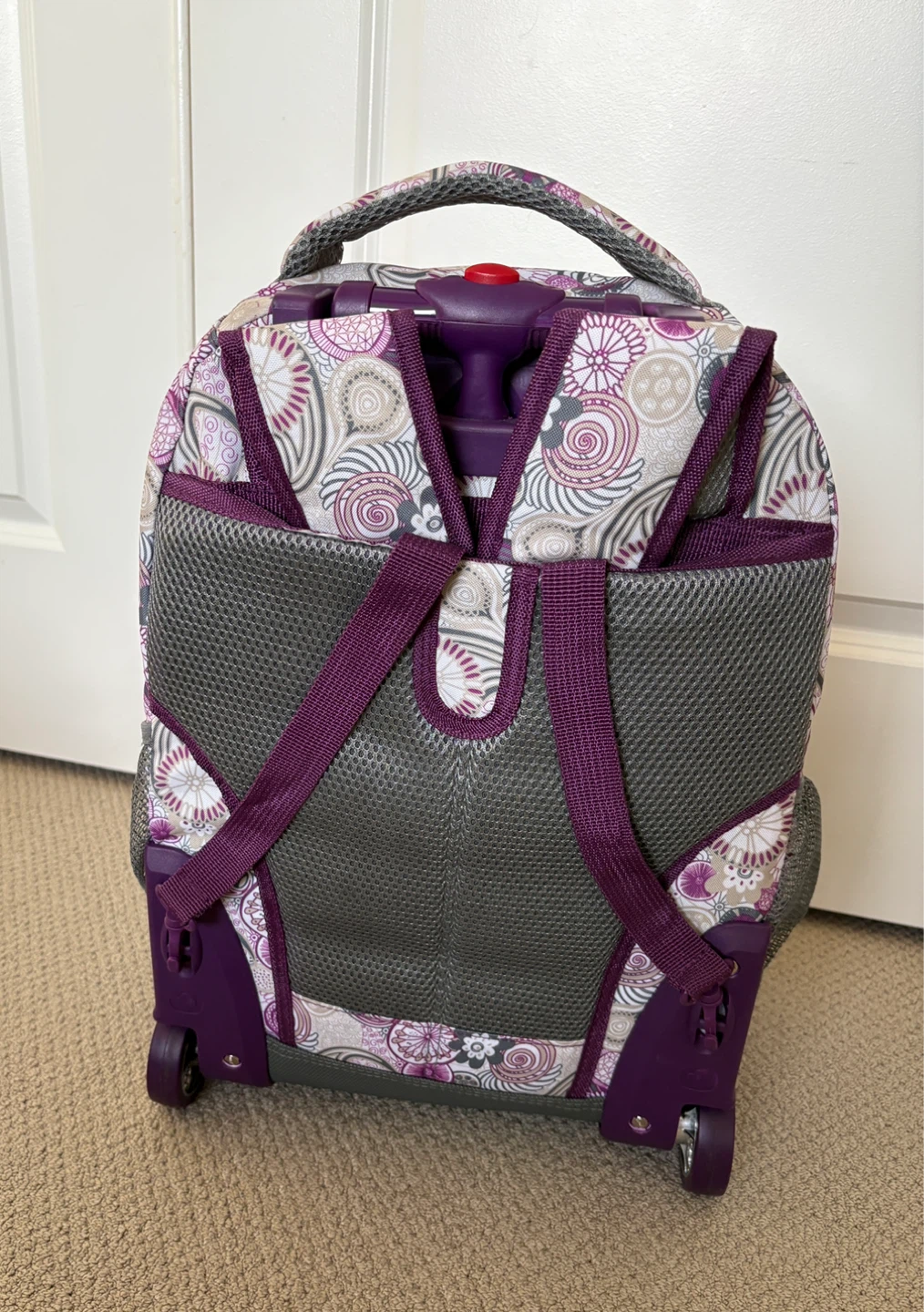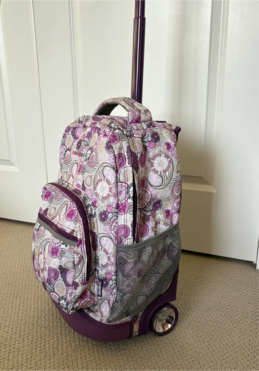 Rolling backpack in a purple floral pattern. It has a telescoping handle and wheels for easy transport, plus shoulder straps for carrying like a regular backpack. The size is about 48 cm x 30cm x 20cm