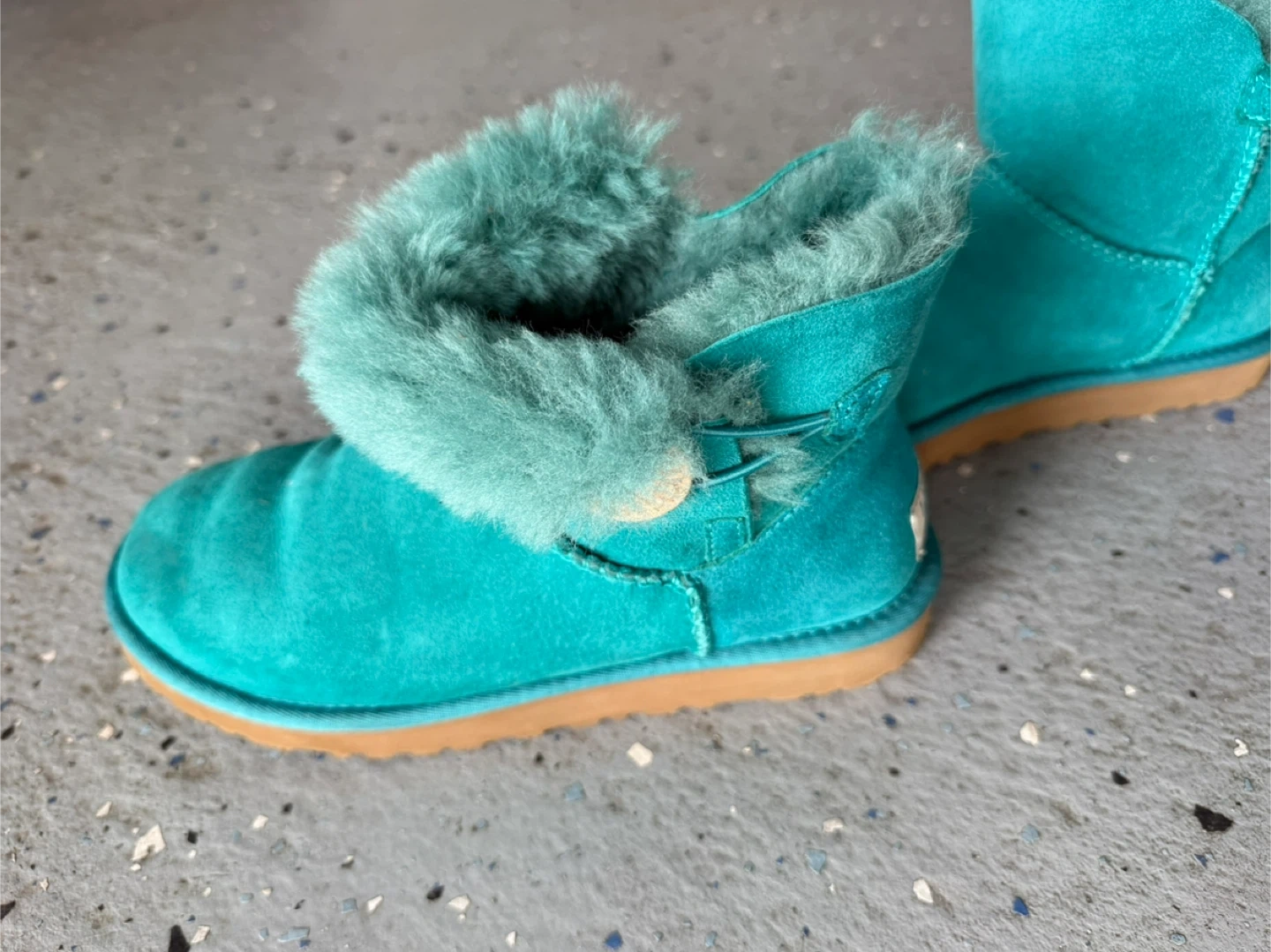 Selling a pair of UGG kids' boots in a lovely turquoise colour! They are a size 8 (US). These boots are super cute and comfy for your little one.