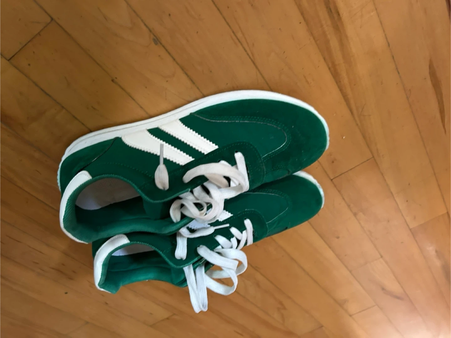 Selling a pair of green like the Adidas Gazelle sneakers. They feature the classic three-stripe design in white and white laces. Great for casual wear!