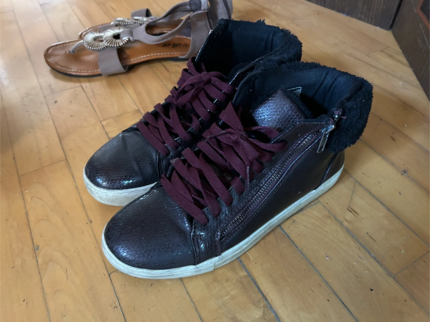 These burgundy high-top sneakers are in good used condition! They feature a unique snakeskin-like texture and stylish side zippers for easy wear. The laces are a matching burgundy colour. Perfect for adding a touch of flair to any outfit!