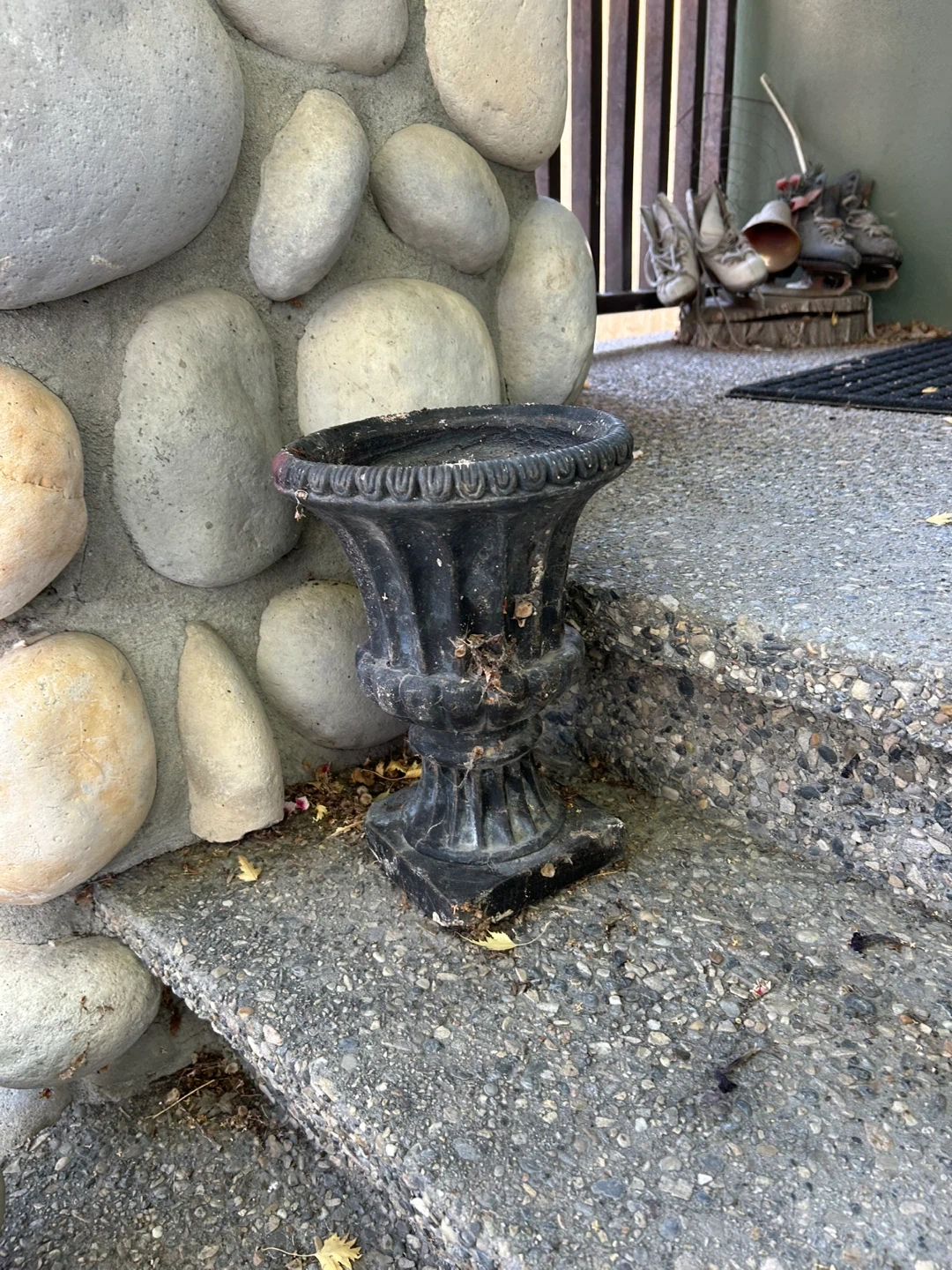 Selling a charming black garden urn! It has a classic design and would look great on a porch or in a garden. It's in used condition with some signs of wear, but still has plenty of life left