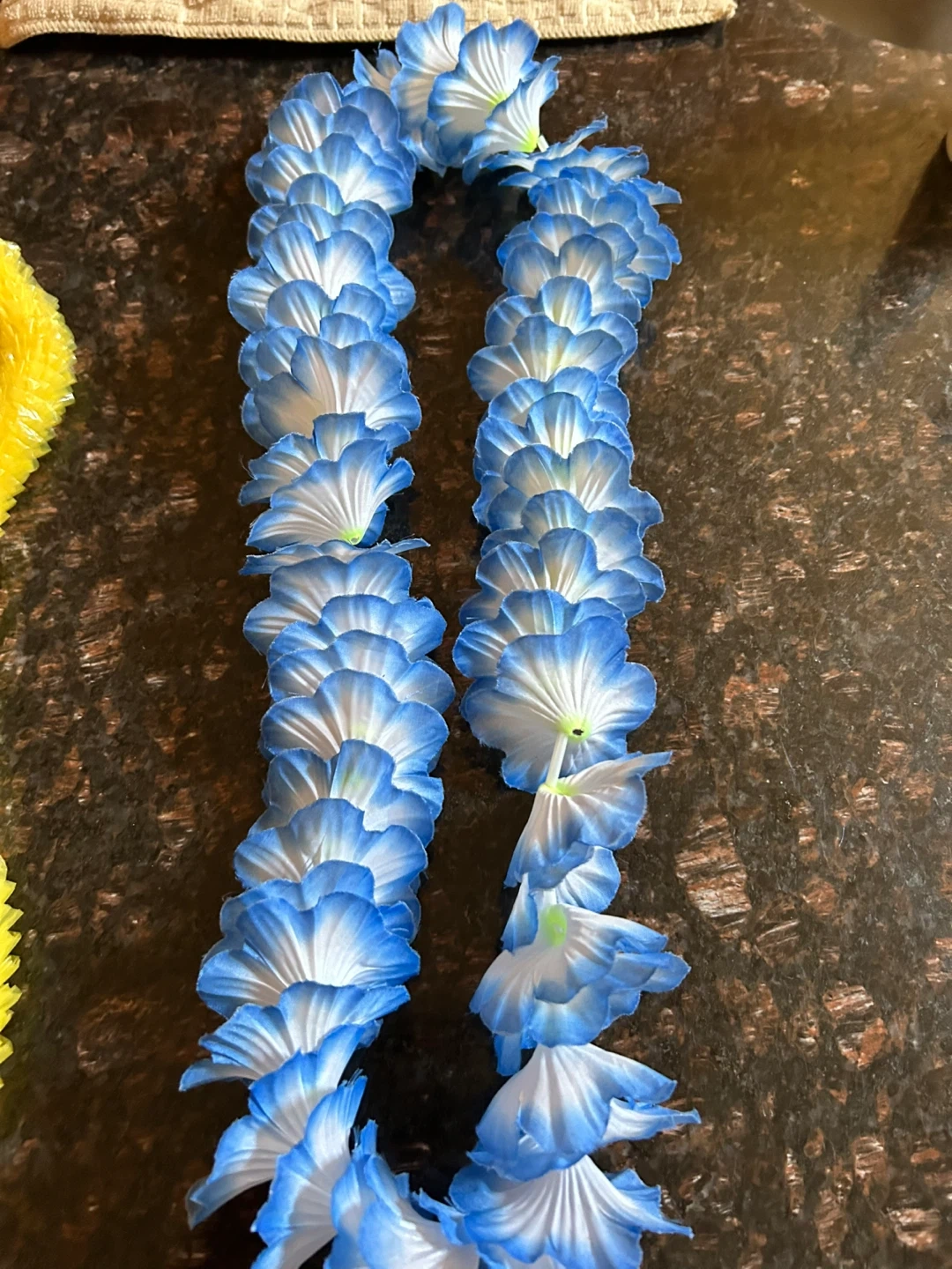 Selling a beautiful blue and white flower lei! Perfect for parties, celebrations, or just adding a touch of tropical flair to your day. It's in great condition and ready for a new home