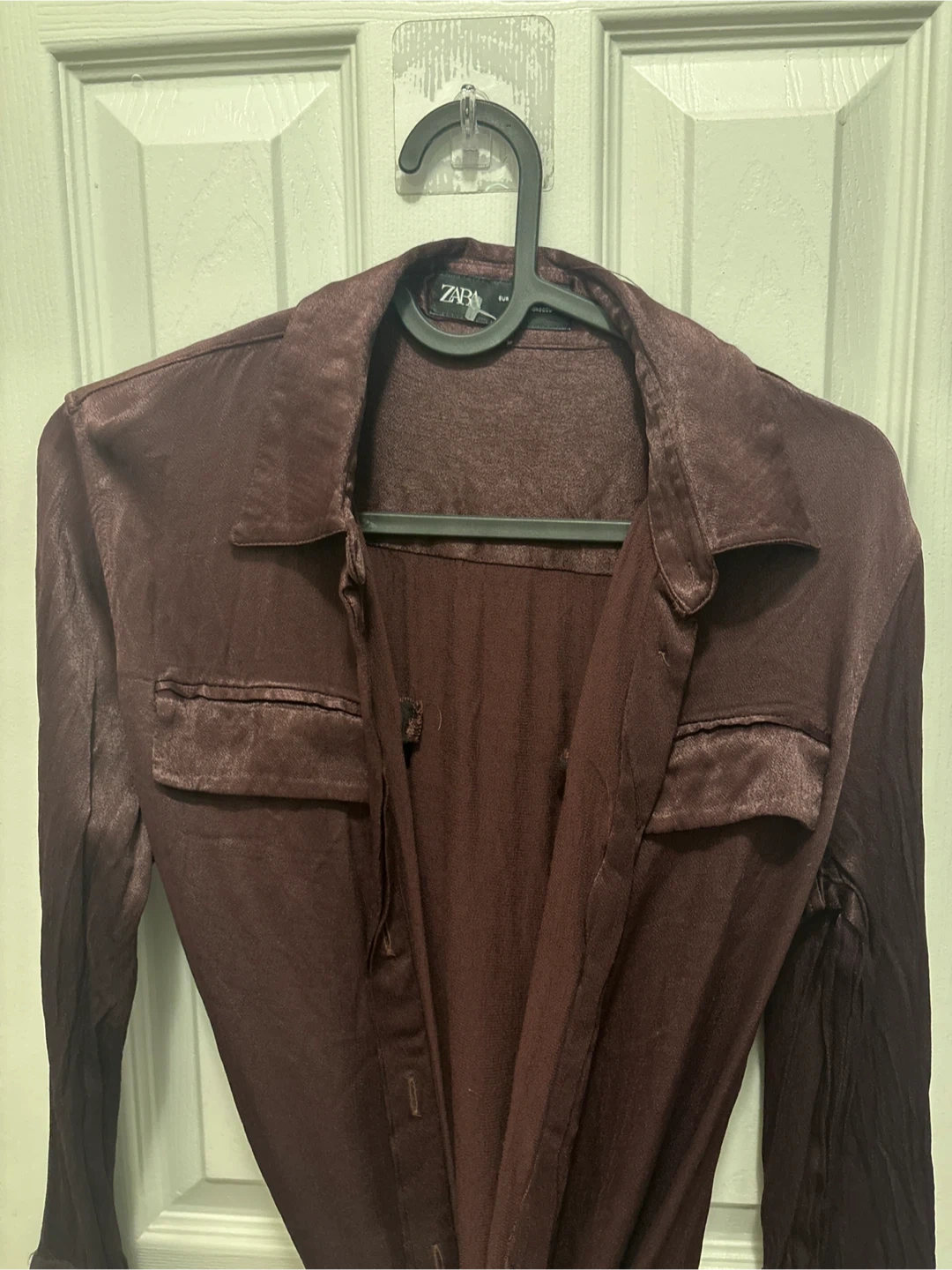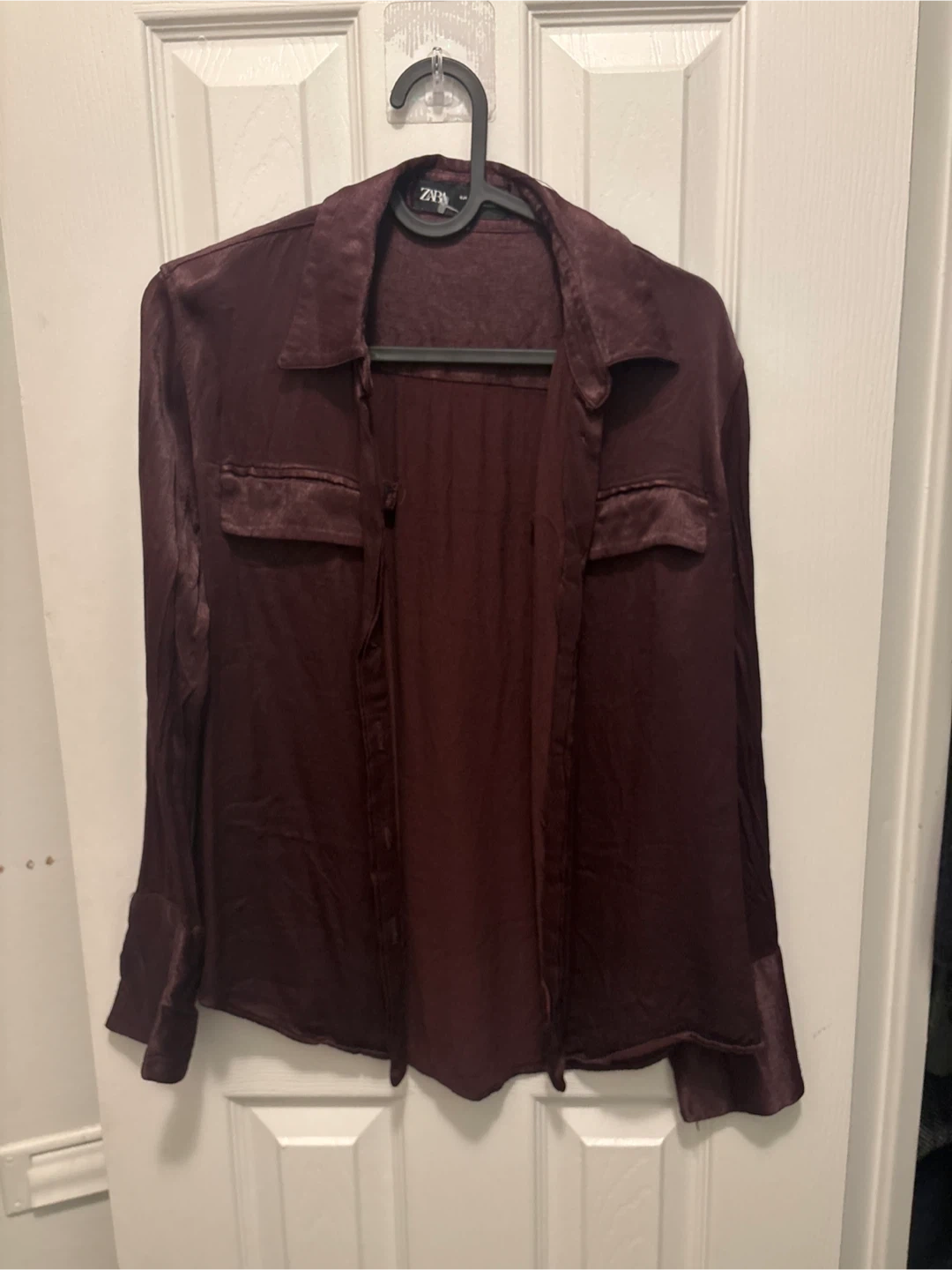 Selling a stylish Zara button-up shirt in a lovely burgundy colour! It's a size small and made in Morocco. Perfect for adding a touch of sophistication to your wardrobe