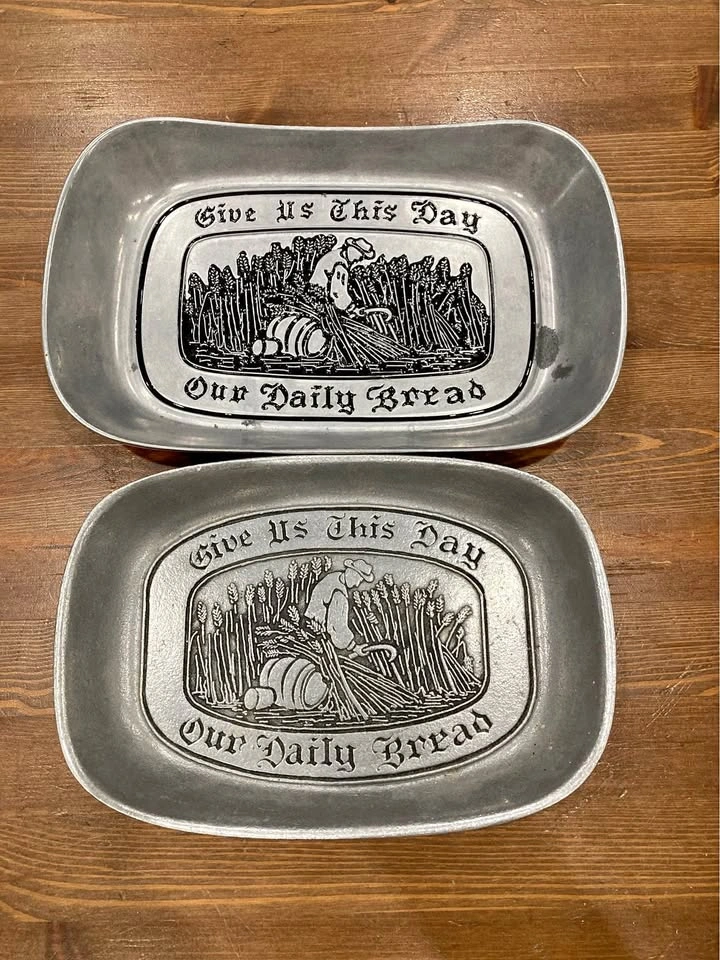 Classic Wilton Armetale metalware serving trays with the raised design of a farmer harvesting wheat and the inscription: “Give Us This Day Our Daily Bread.”