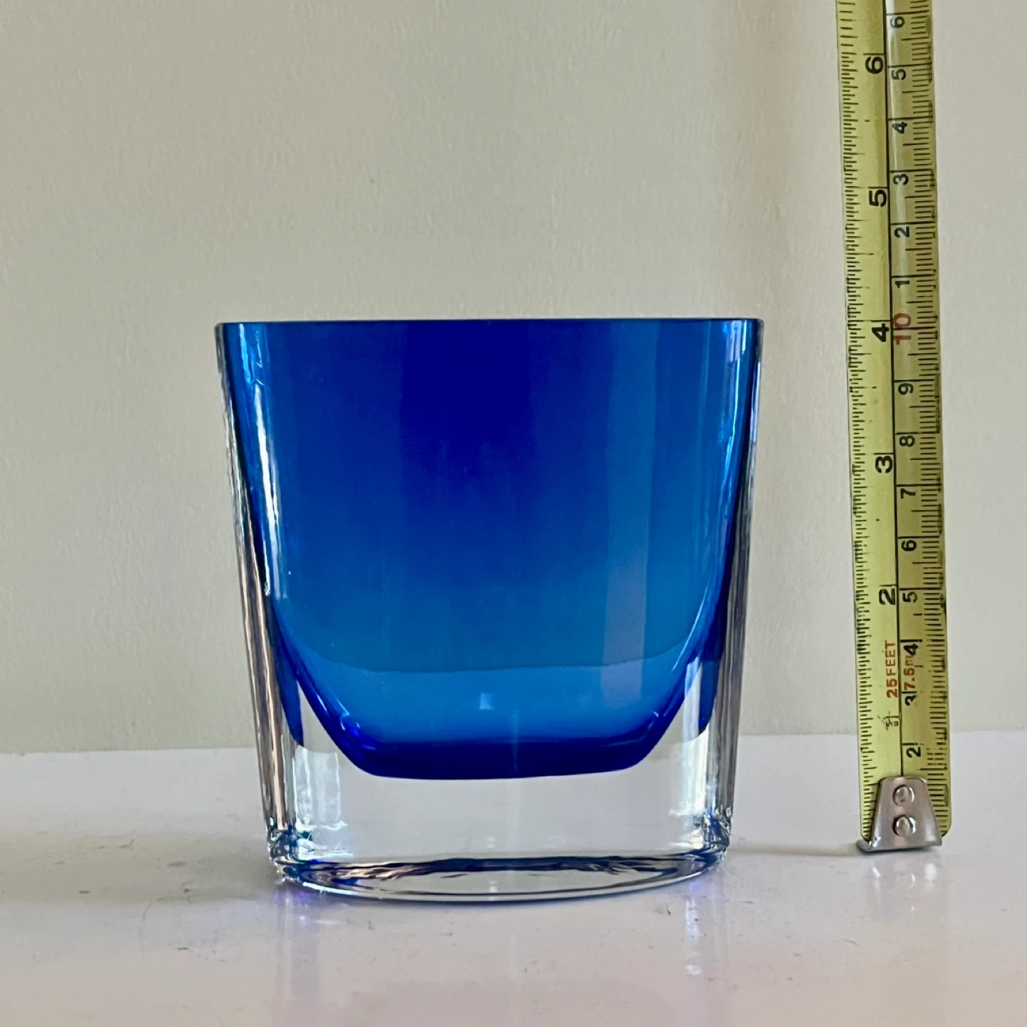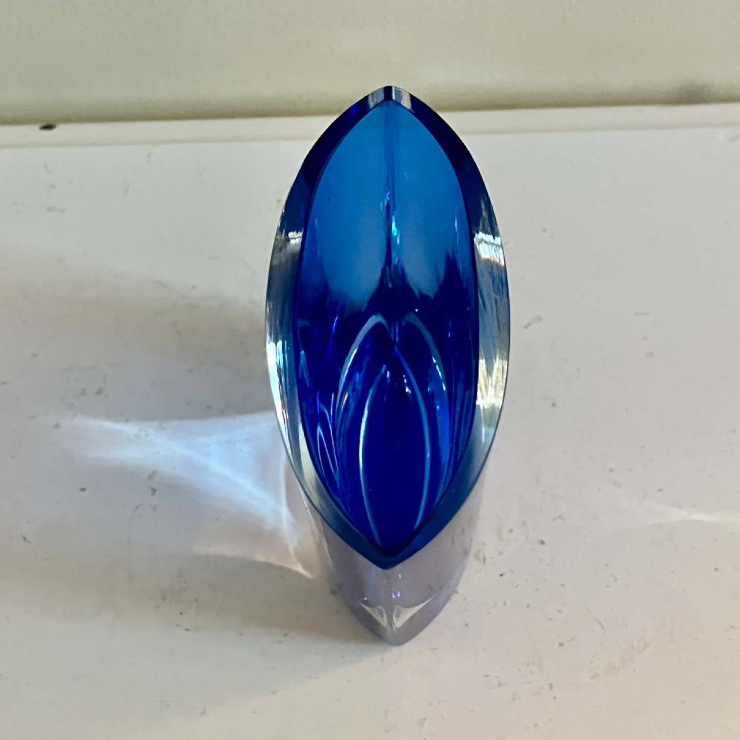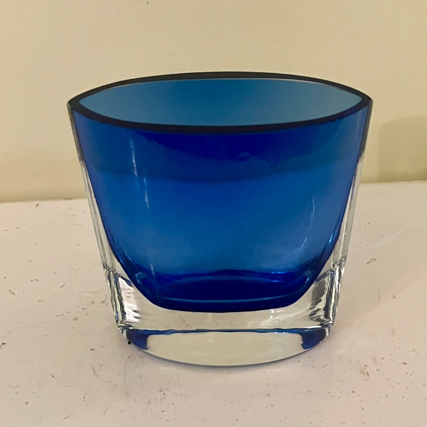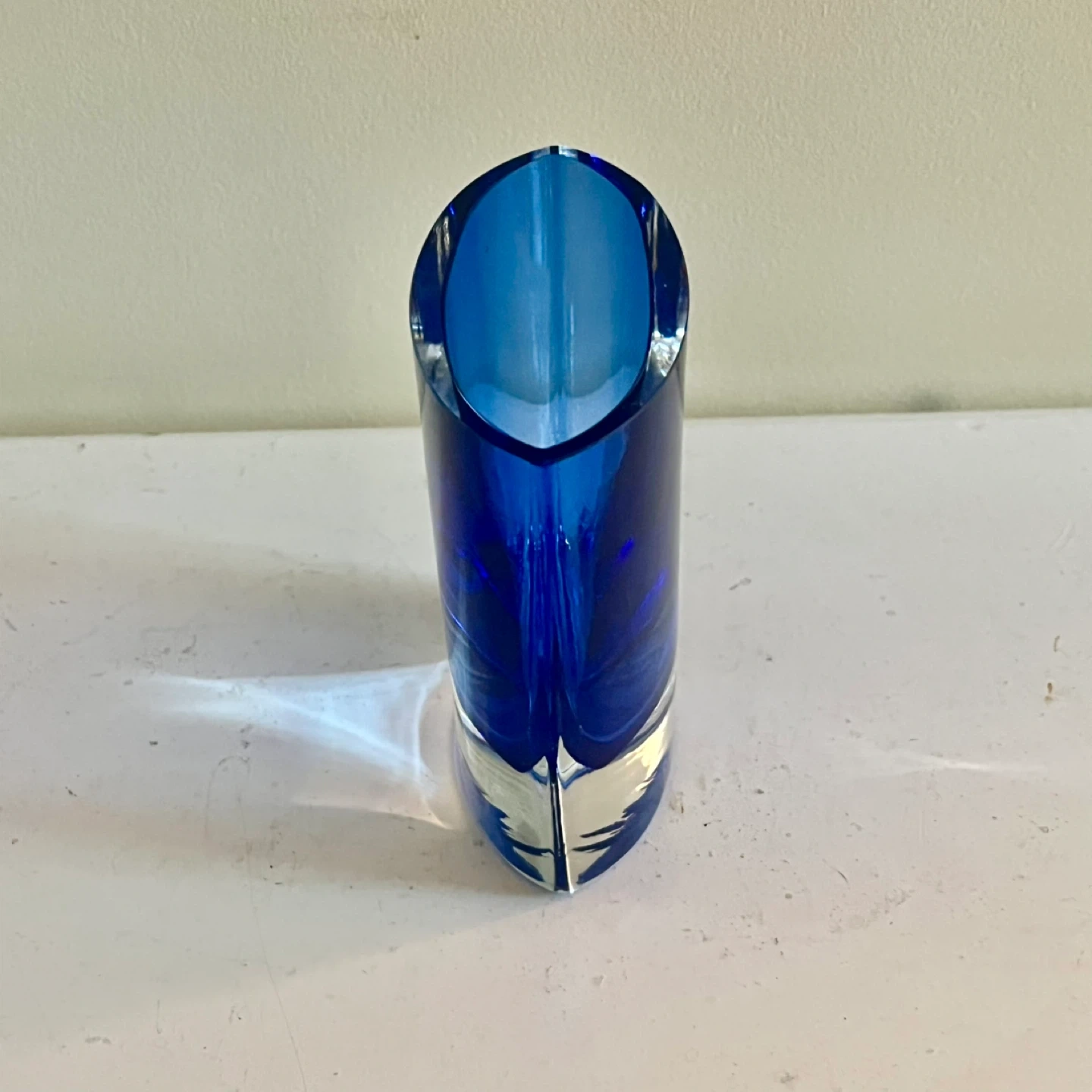 Beautiful vintage blue glass vase from Krosno, Poland. Stands approximately 10.5 cm tall, with dimensions of 11 cm in length and 5 cm in width. Its unique shape and vibrant blue colour make it a perfect decorative piece for any room.