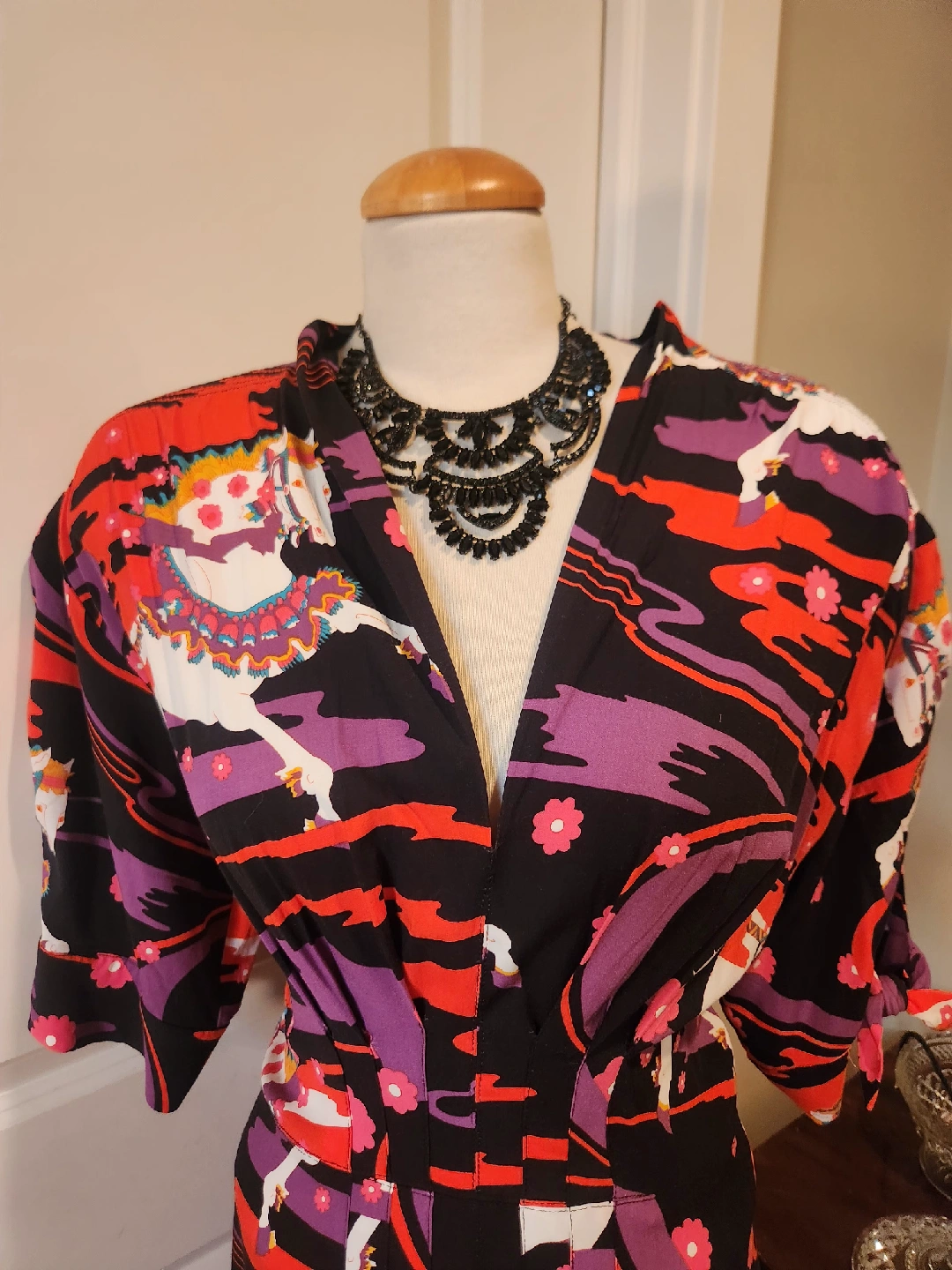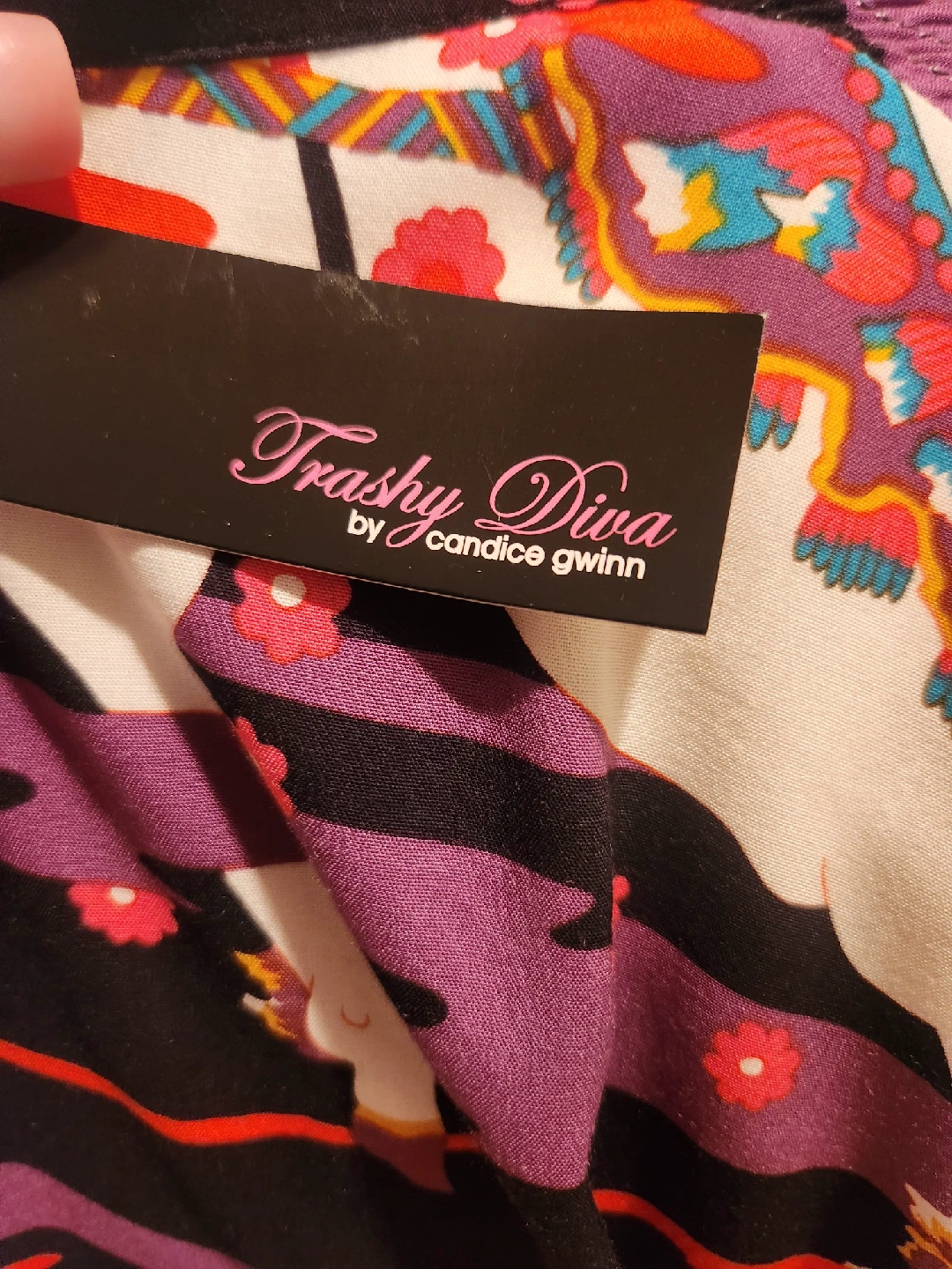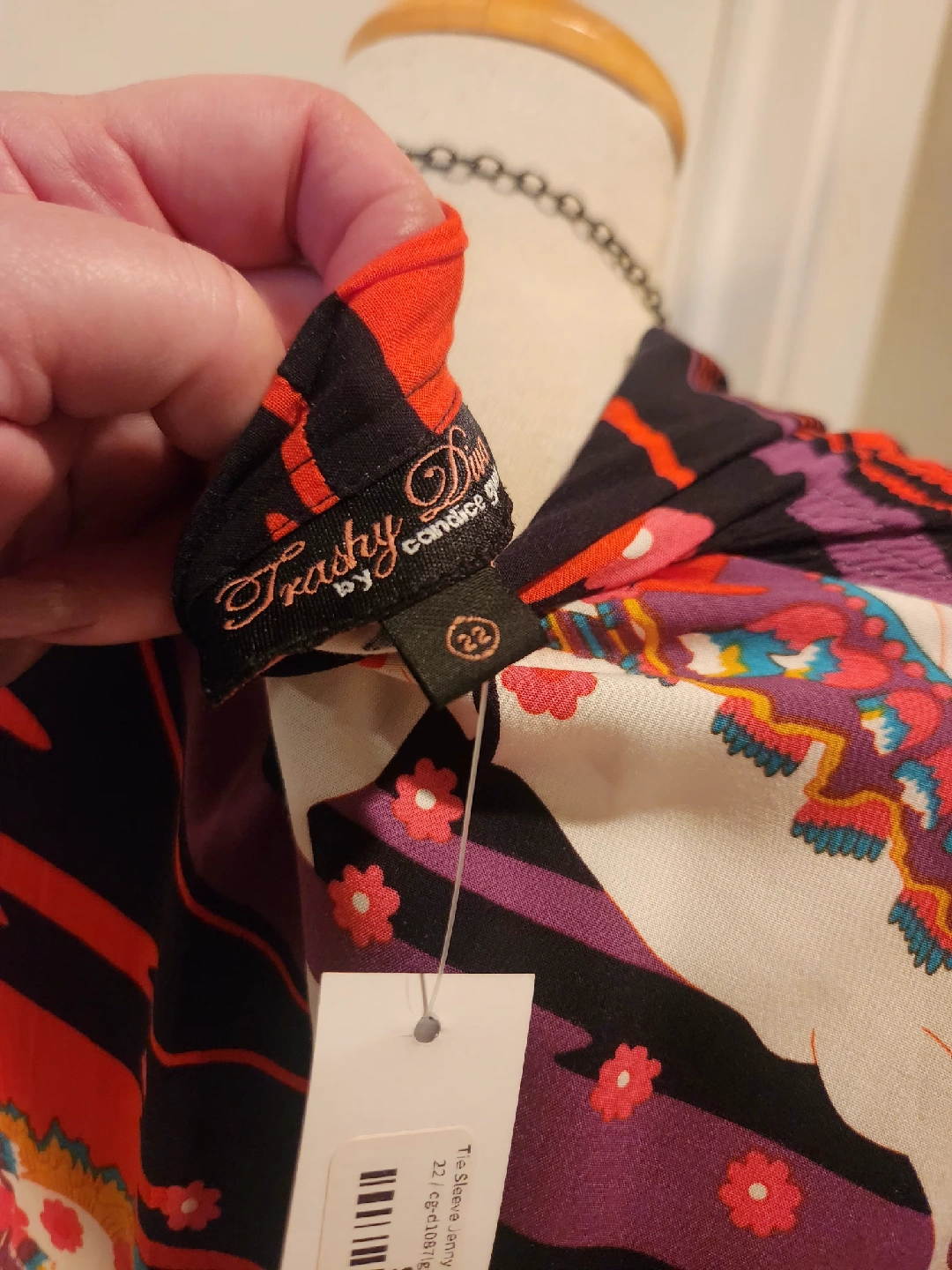 This brand is not sold in Canada.VERY FLATTERING plus size dress! Tie Sleeve size 22 (fits 20, 22, 24) fit and flare gown from boutique brand TRASHY DIVA full length dress with a Carousel Ponies design. It's a vibrant and eye-catching piece! Fabric has slight stretch for flattering silhouette. Hidden side zipper Purchased in New Orleans from exclusive Plus size friendly boutique TRASHY DIVA The original price was $225.00 US DOLLARS. Perfect holloween event dress. Looks wonderful with full lenght gloves! FANTASTIC QUALITY, UNIQUE DESIGN