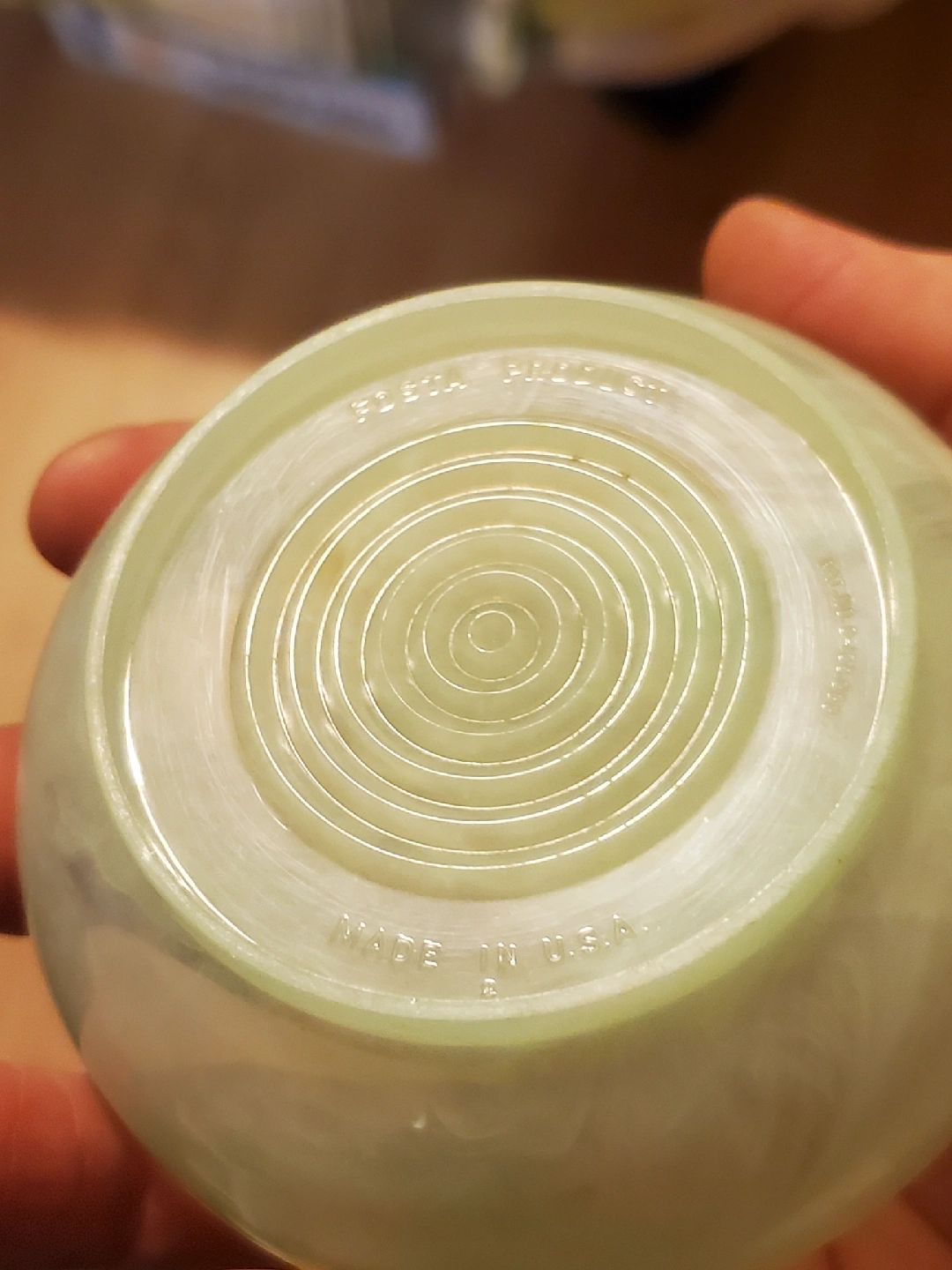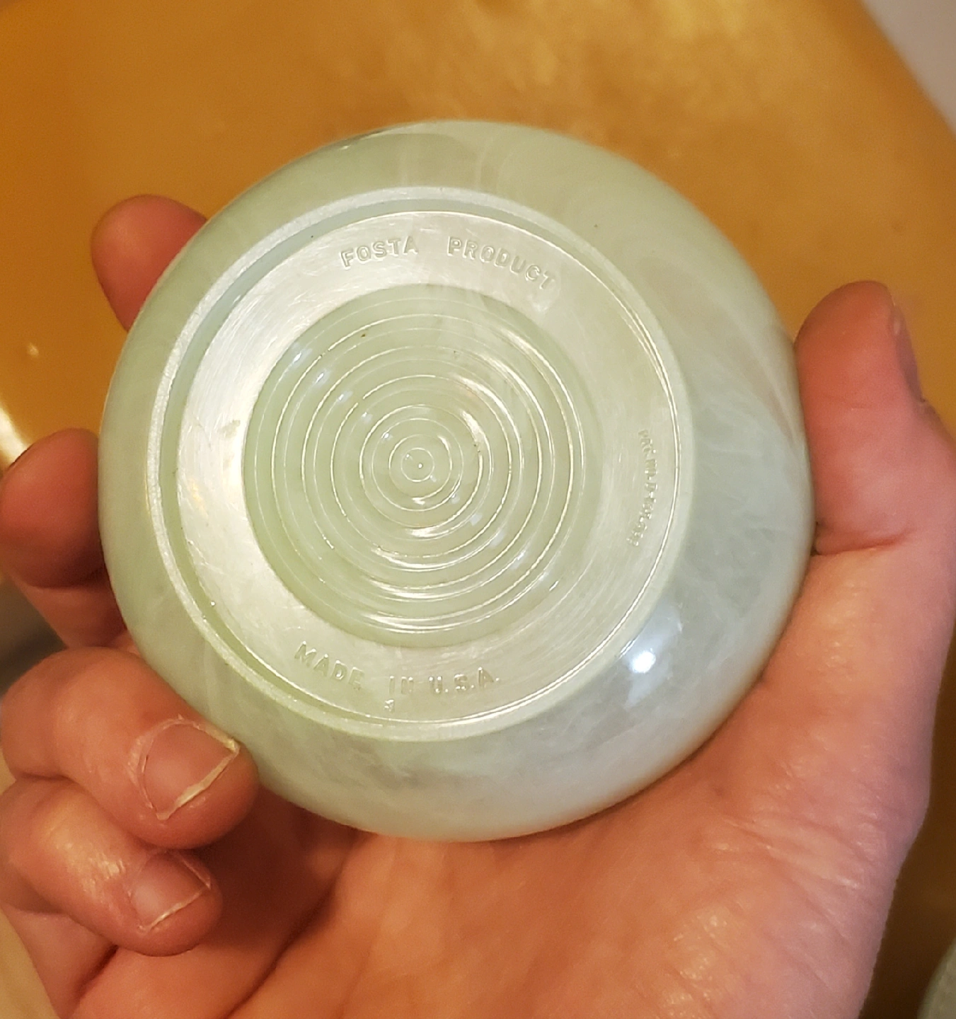 Here are two vintage plastic Fosta powder containers with lids. The colour is a light green jade in a swirl design.