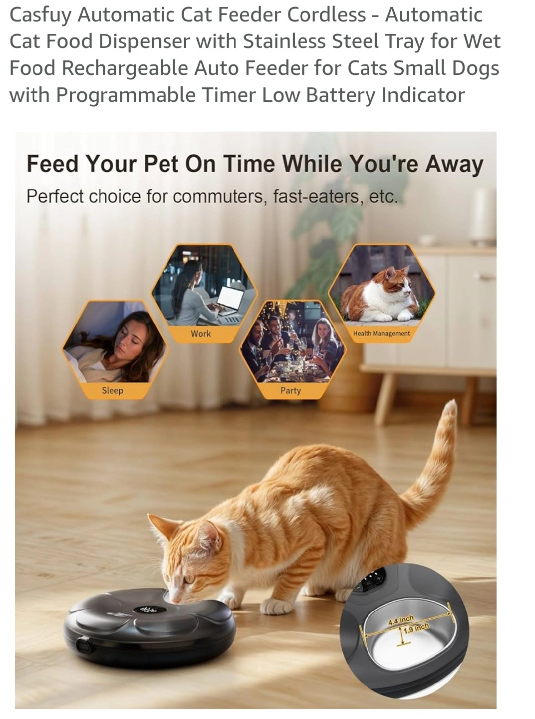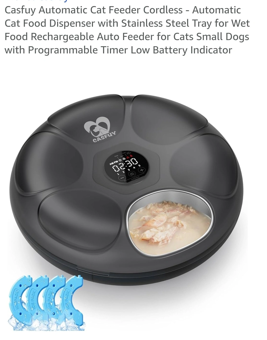 I'm selling a Casfuy Automatic Cat Food Dispenser. It's a cordless, rechargeable auto feeder with a stainless steel tray, perfect for wet or moist food. It also comes with 4 ice packs. It's designed for cats and small dogs and includes a programmable timer and low battery indicator. The dispenser features multiple slots for different food types, including fresh food, freeze-dried food, biscuits, canned food, dry food, and snacks. Each slot holds 200ml.
