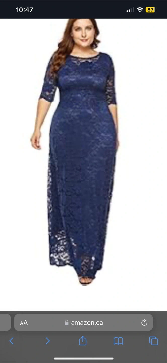 Beautiful navy blue lace maxi dress. It features a round neckline and 3/4 sleeves. Perfect for a special occasion! Never worn.
