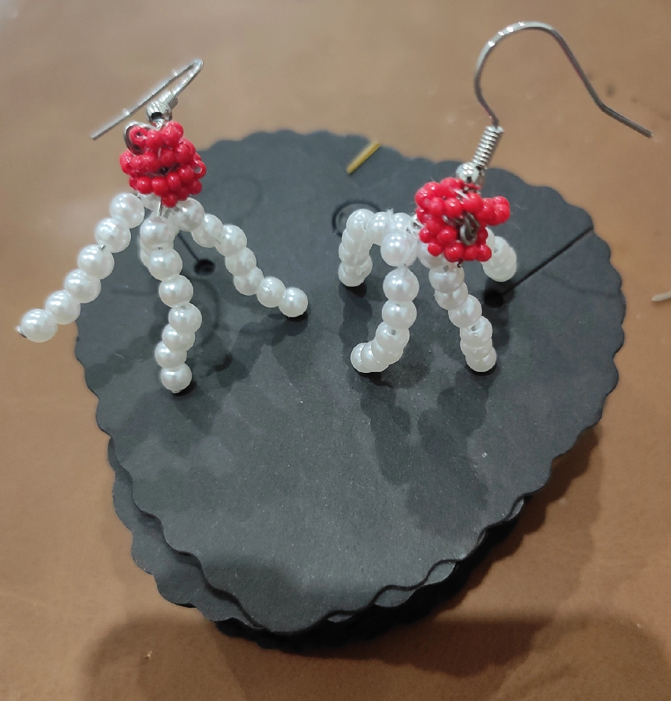 These are a cute pair of handmade earrings! They feature a red beaded flower detail and white pearl-like beads. Perfect for adding a unique touch to any outfit