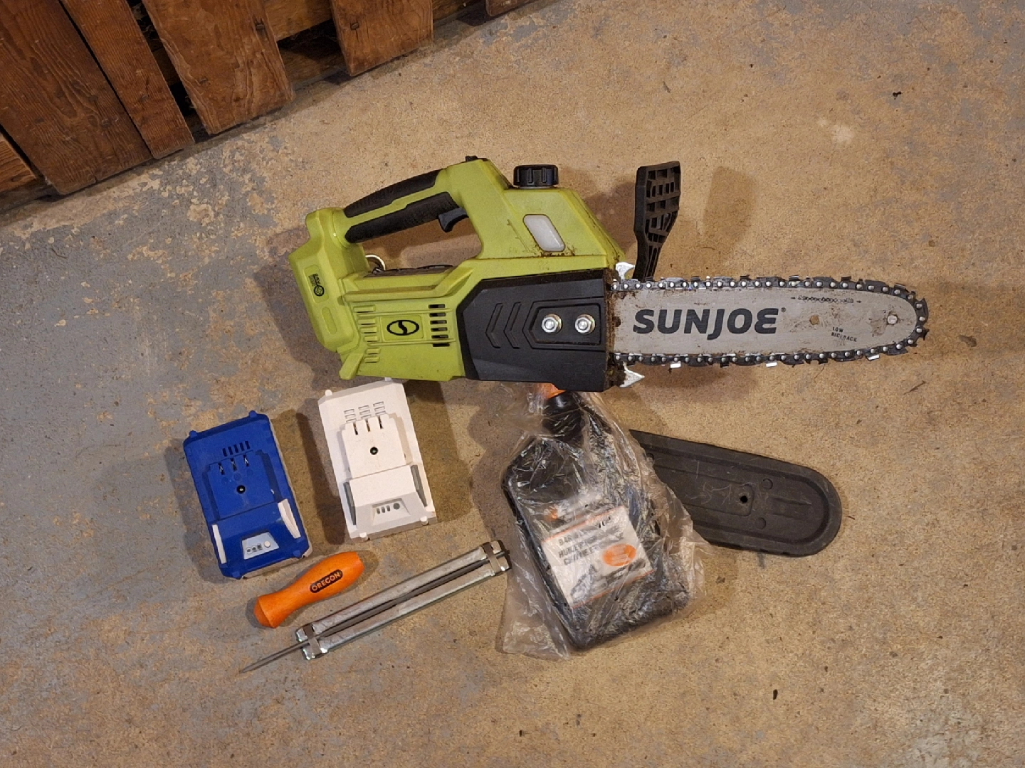 73Selling a Sun Joe cordless chain saw kit. It includes the chain saw, two batteries and charger (one original and one 3rd party-bought for $70,never used,kept as backup), chain oil, a sharpening and tension tool. Echo oil, more than half bottle left. Used for MTB trail building just a few times. working great and super light.