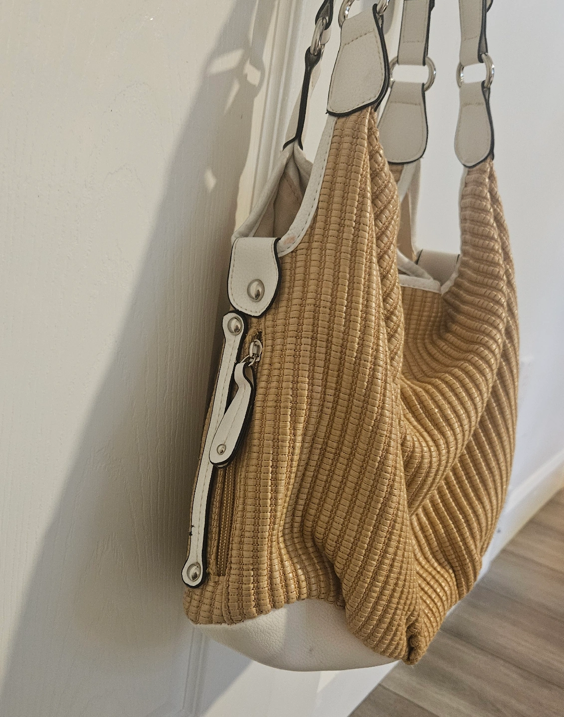 Selling a hobo bag in a lovely woven material with white accents. It's in great shape and perfect for everyday use. The size is ideal for carrying your essentials while still being lightweight and comfortable to carry on your shoulder. It's a stylish addition to any outfit!