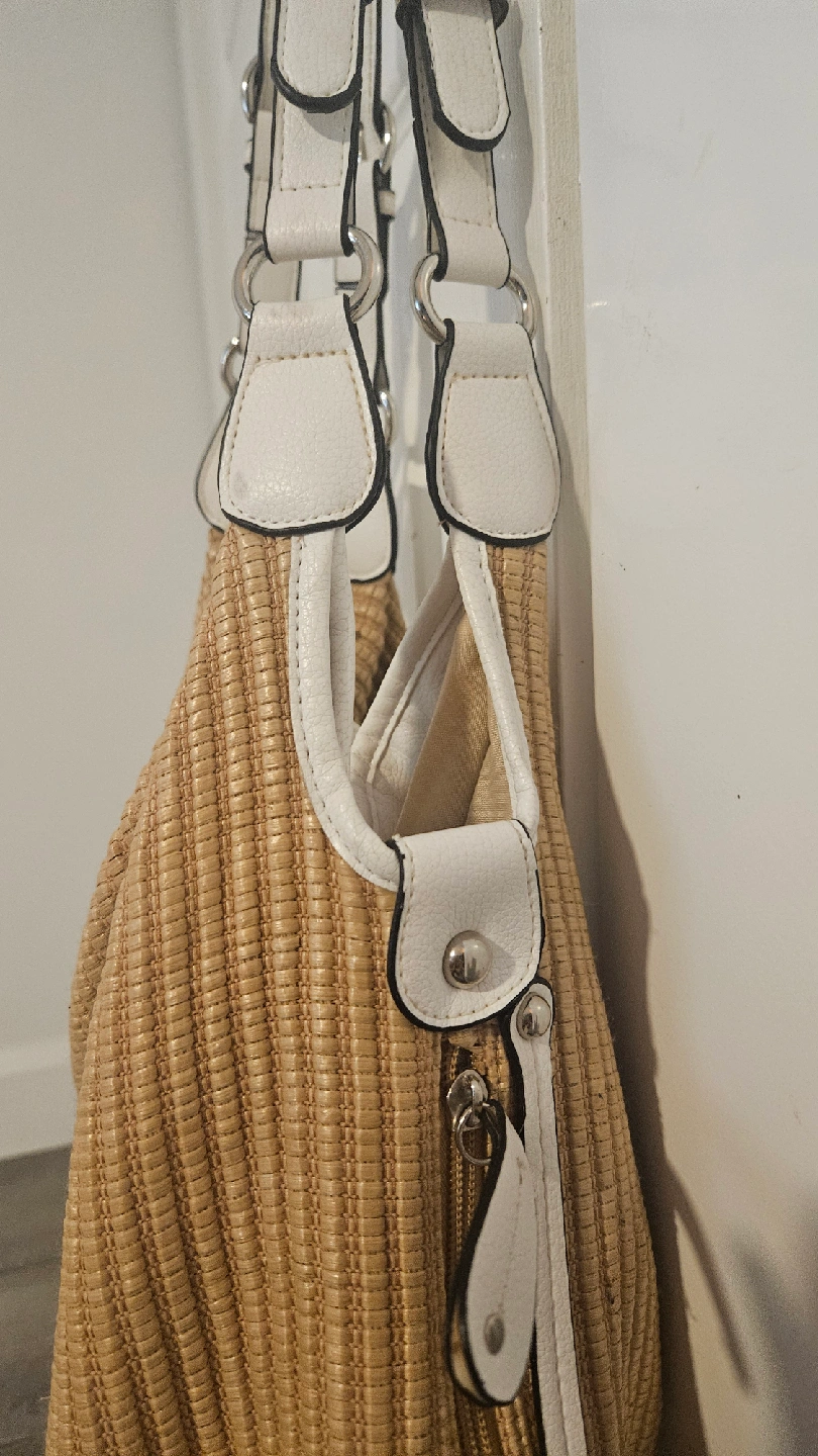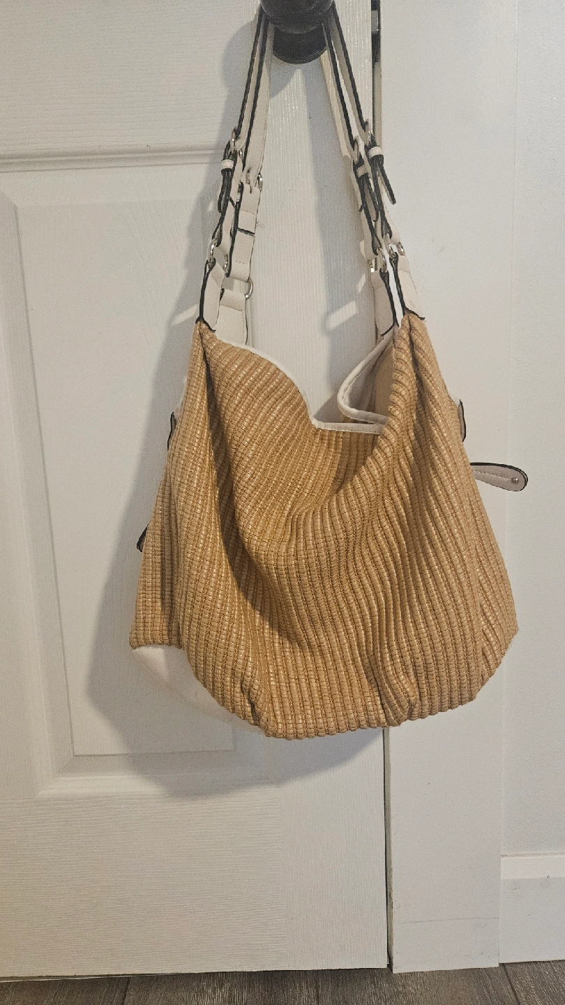 Selling a hobo bag in a lovely woven material with white accents. It's in great shape and perfect for everyday use. The size is ideal for carrying your essentials while still being lightweight and comfortable to carry on your shoulder. It's a stylish addition to any outfit!