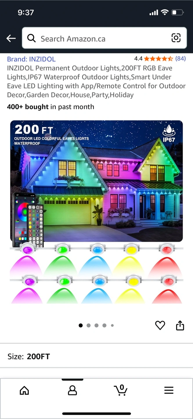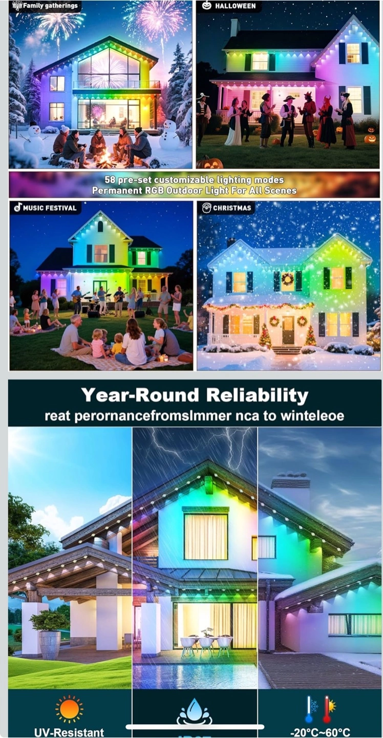 I'm selling a brand new set of INZIDOL permanent outdoor lights! These 200FT RGB eave lights are perfect for adding some colour to your home. They are waterproof with an IP67 rating and are made with anti-UV material, so they can be used for up to 50,000 hours. They also have 58 pre-set customizable lighting modes that you can control through an app or remote!