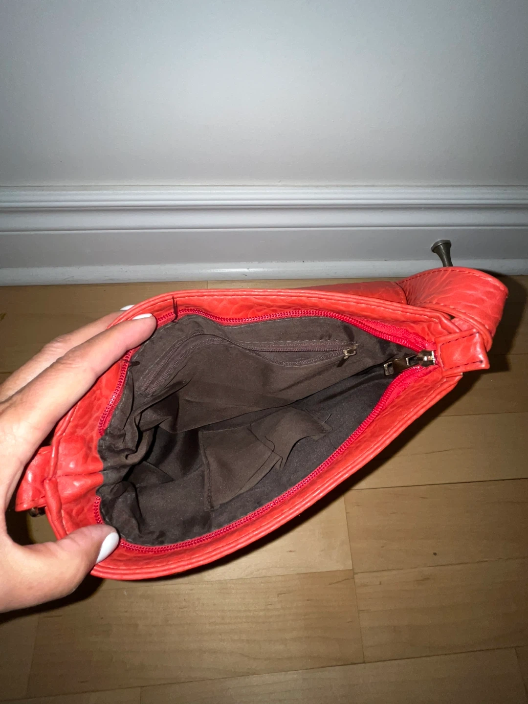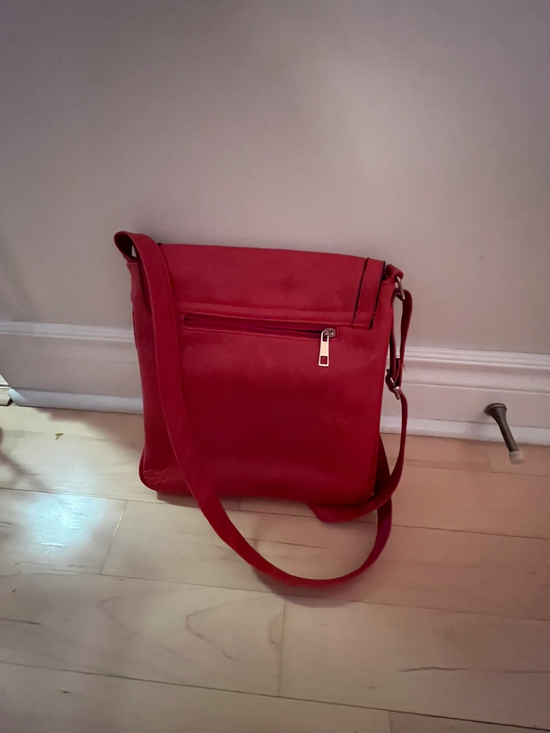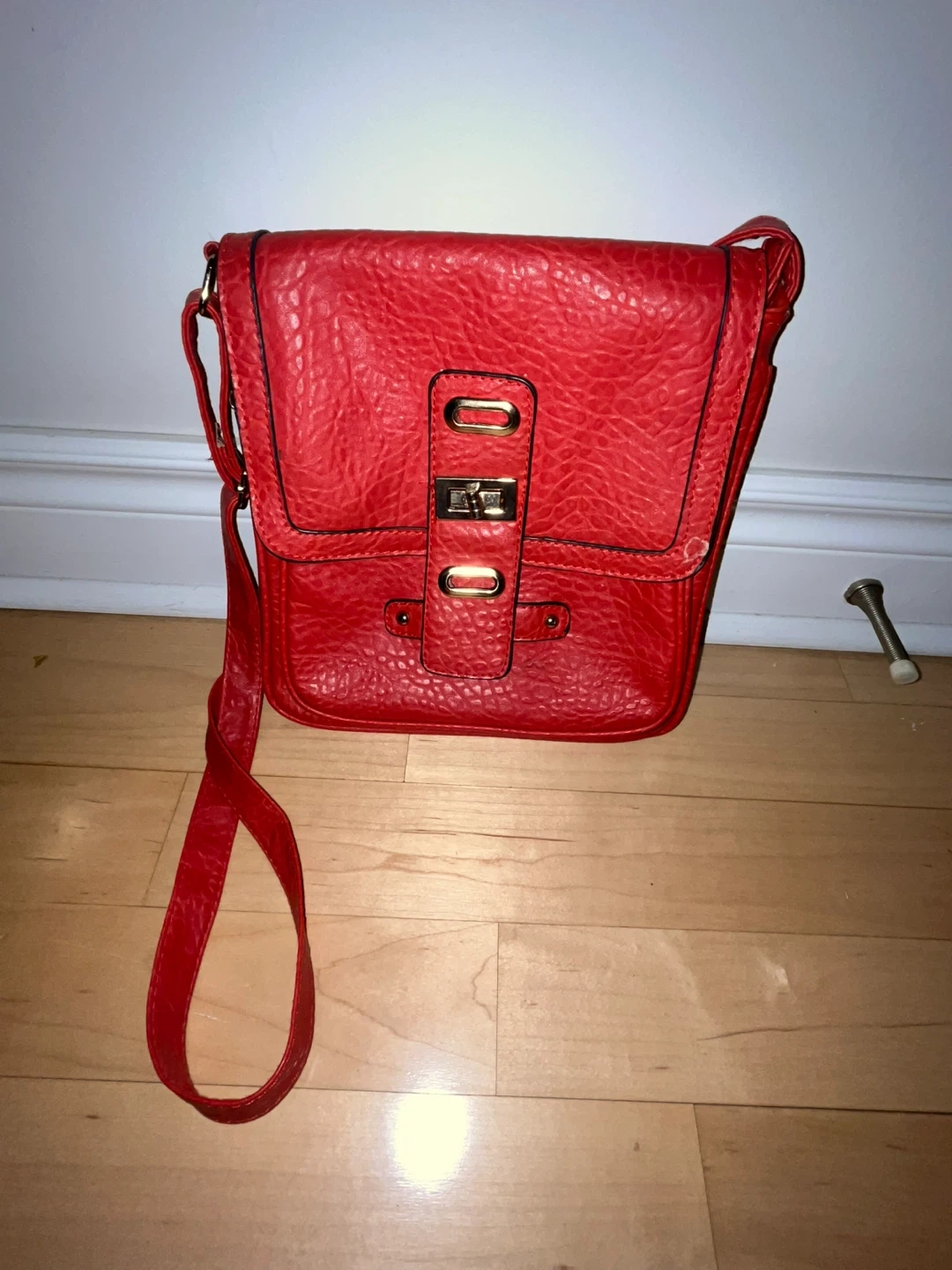 A stylish red crossbody bag that's perfect for everyday use! It has a secure clasp and an adjustable strap for comfortable wear. Inside, there's a zippered pocket to keep your valuables safe and organized. Man made leather.
