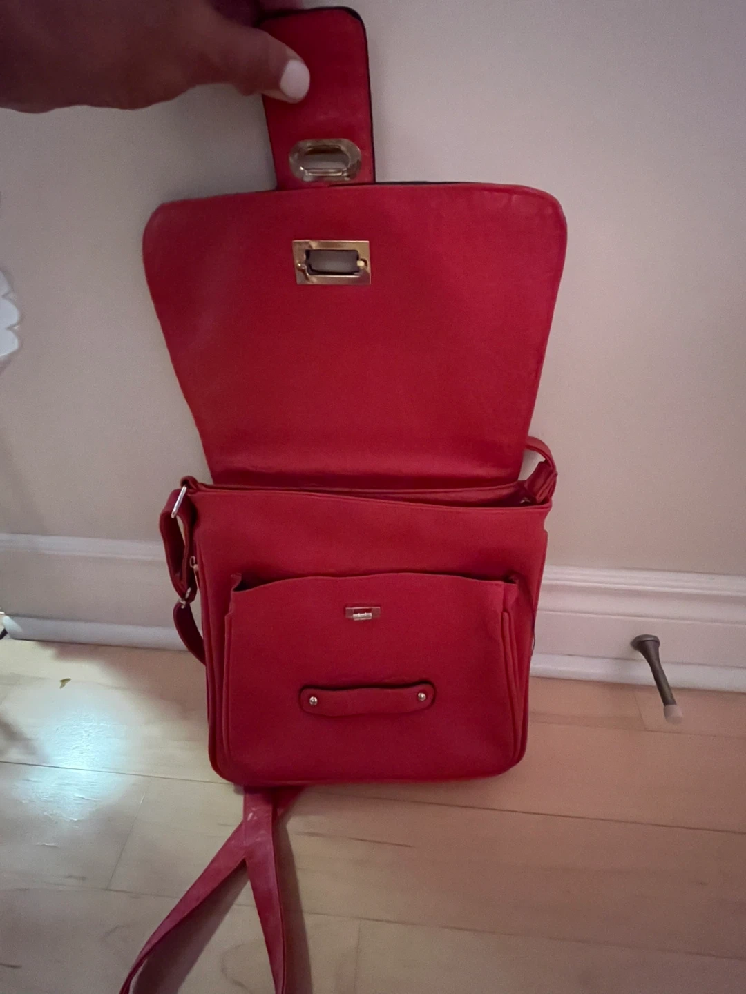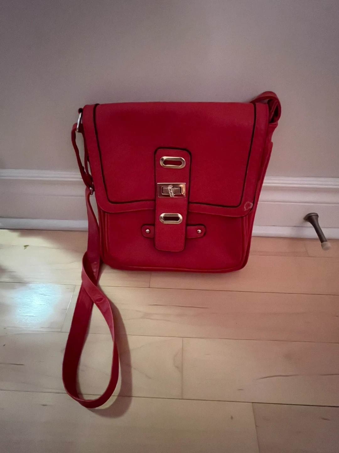 A stylish red crossbody bag that's perfect for everyday use! It has a secure clasp and an adjustable strap for comfortable wear. Inside, there's a zippered pocket to keep your valuables safe and organized. Man made leather.