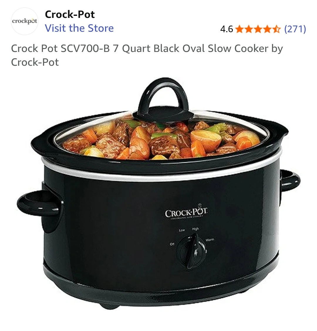 Selling a Crock-Pot slow cooker! It's a 7-quart black oval model, perfect for making meals for up to 9 people or a 7 lb roast. The stoneware is removable and dishwasher safe, and it has a convenient warm setting. The original box is included
