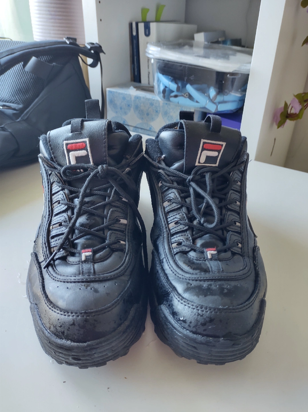 (Its just water on the shoes) Fila Disruptor II sneakers in black! In very good shape and excellent condition except a little bit of cushion wear and tear. You can simply put cushion pads available on temu/ Amazon or in Dollarama