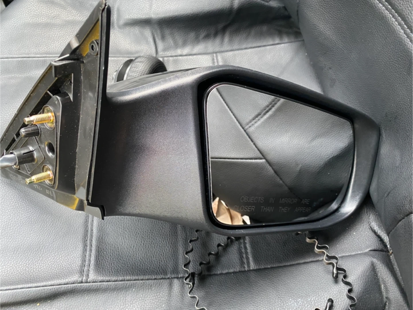 Selling a car side mirror. It says "OBJECTS IN MIRROR ARE CLOSER THAN THEY APPEAR" on the mirror itself. The part number appears to be 22-816169R-00. It's made of PVC.