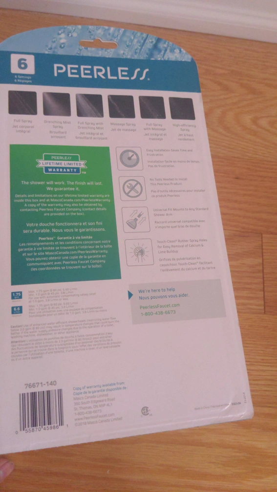 Selling a brand new Peerless massage hand shower still in its original packaging! It features 6 settings and a 60" flexible hose. This shower head is universal fit and has Touch-Clean rubber spray holes for easy removal of calcium and lime buildup. It's ready to install and enjoy a relaxing shower experience!