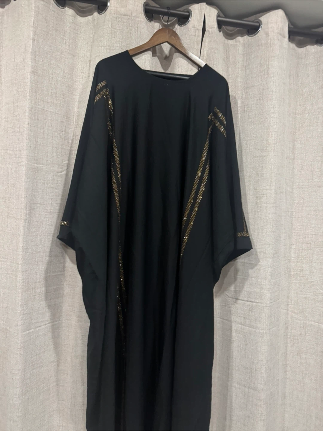 Selling a beautiful black abaya with gold embellishments. It's in great condition and ready for a new home! The fabric is flowy and comfortable, perfect for any occasion. The gold detailing adds a touch of elegance to the classic black design