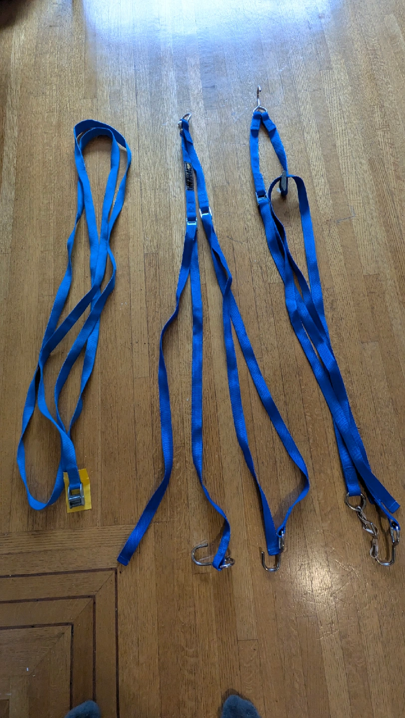 60I have 2 blue straps with hooks for sale for mounting the boat on your car. The hooks are for tying down the front and stern of boat to undercarriag. They are in good condition and am throwing in additional long regular strap for securing boat to roof rack.