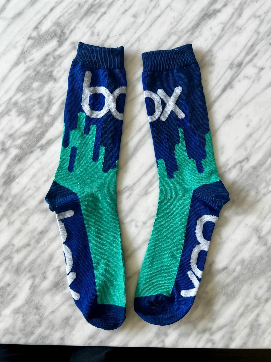 Selling a pair of fun novelty dress socks! They feature a cool blue and green design. Perfect for adding a pop of colour to your outfit