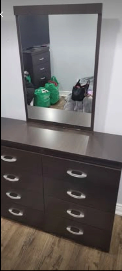 Selling a dresser set in dark brown. Includes a tall dresser, a wide dresser, a mirror, and a nightstand. They are in good condition and would be perfect for a bedroom set!