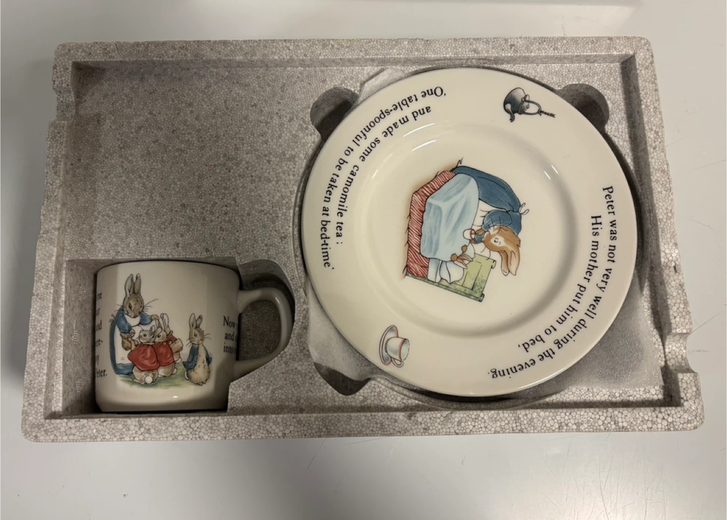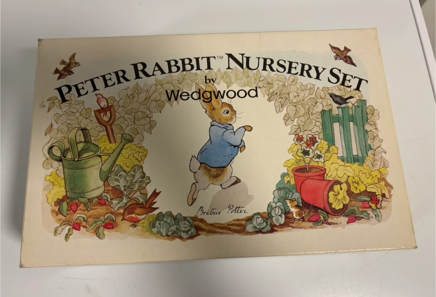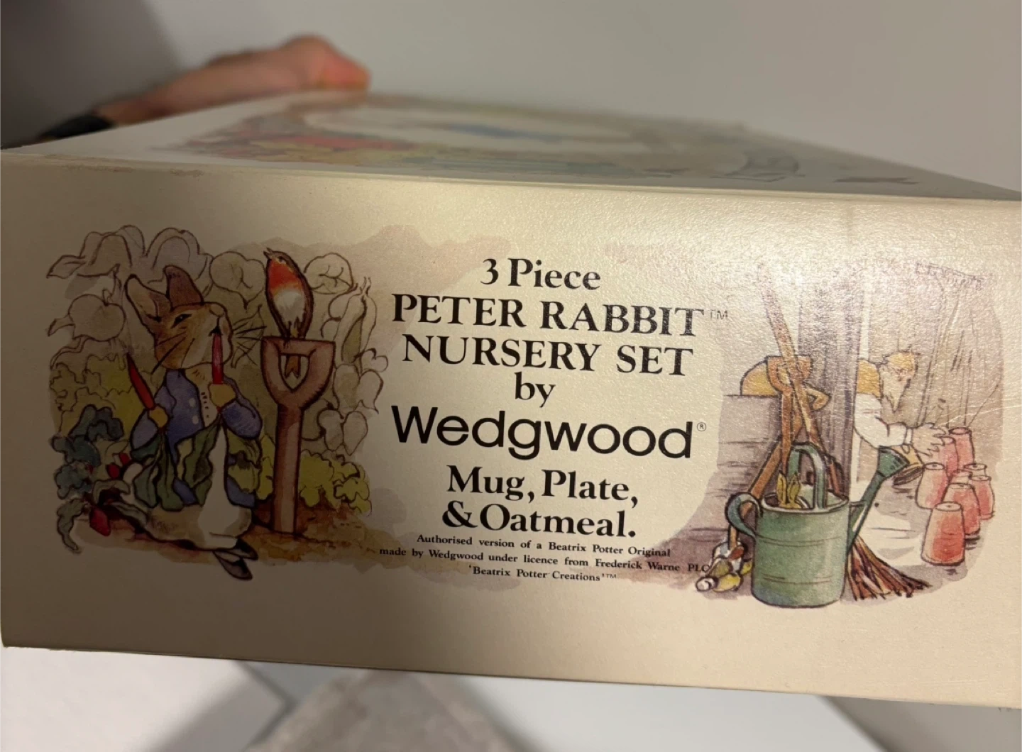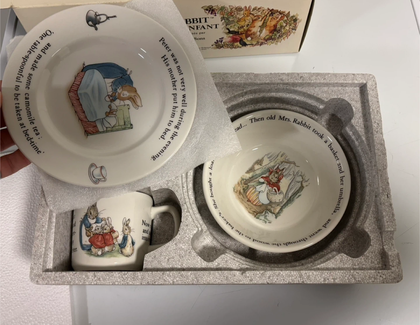 Selling a Wedgwood Peter Rabbit 3-piece nursery set! This set includes a mug, plate, and oatmeal bowl, all adorned with classic Peter Rabbit illustrations. It comes in its original box.