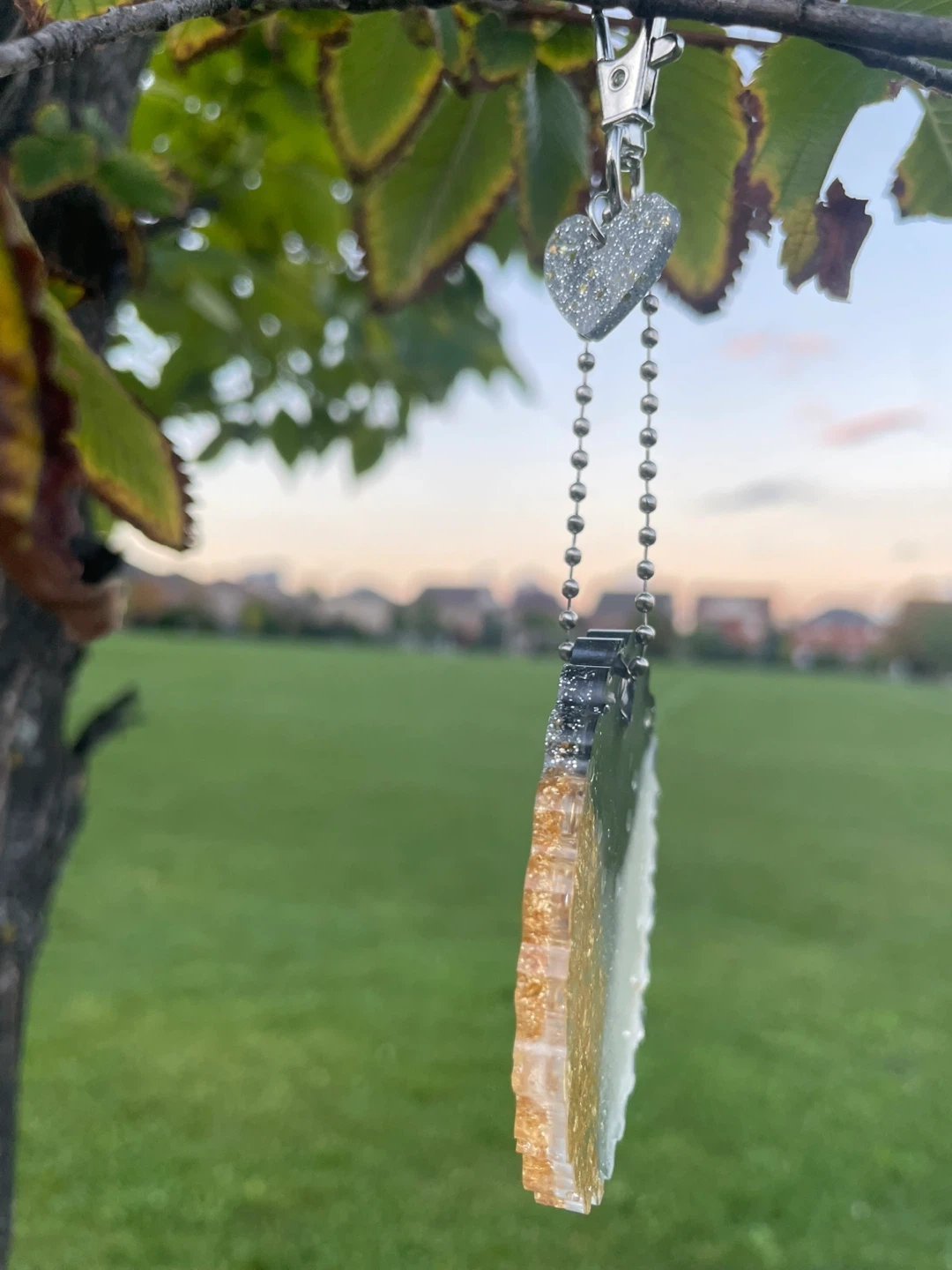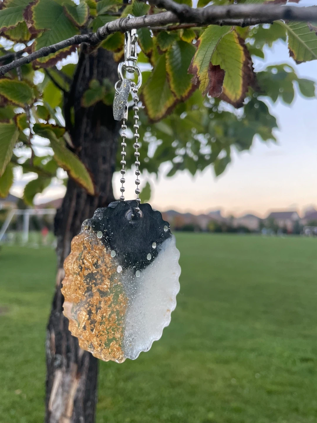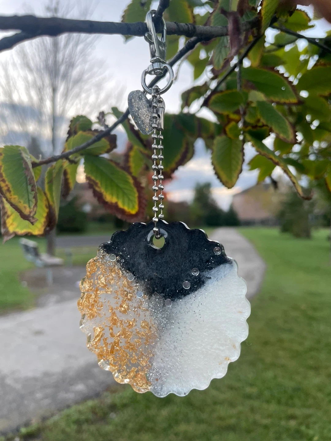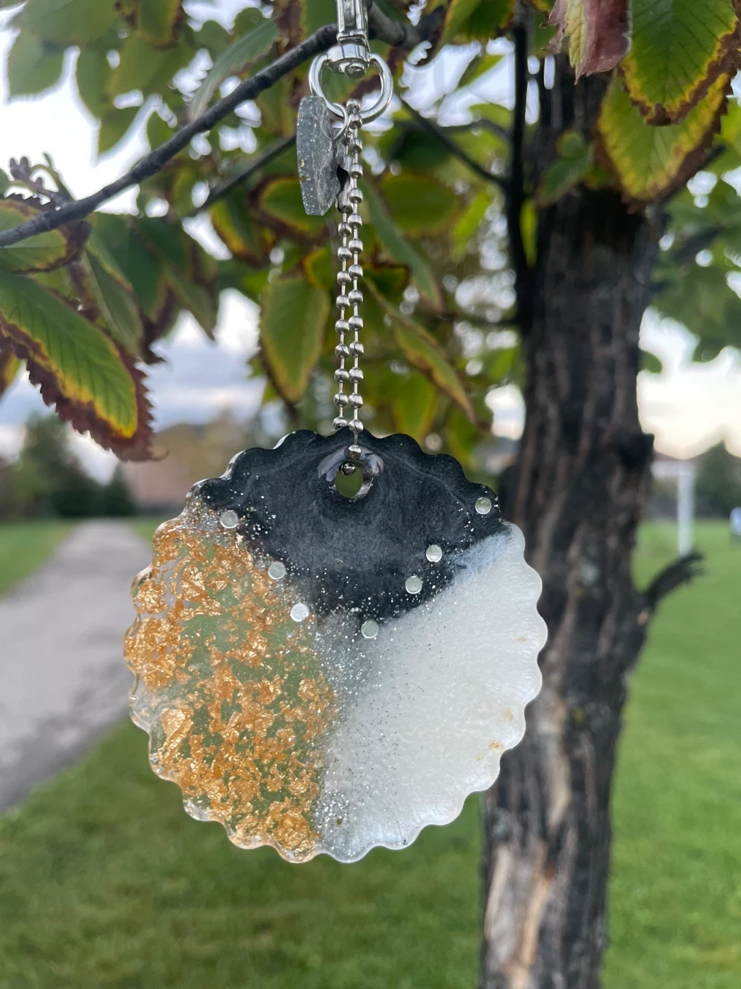 34Selling a handmade resin keychain! It features a unique design with black, gold leaf, and white resin. It's in great condition and would make a lovely addition to your keys or bag