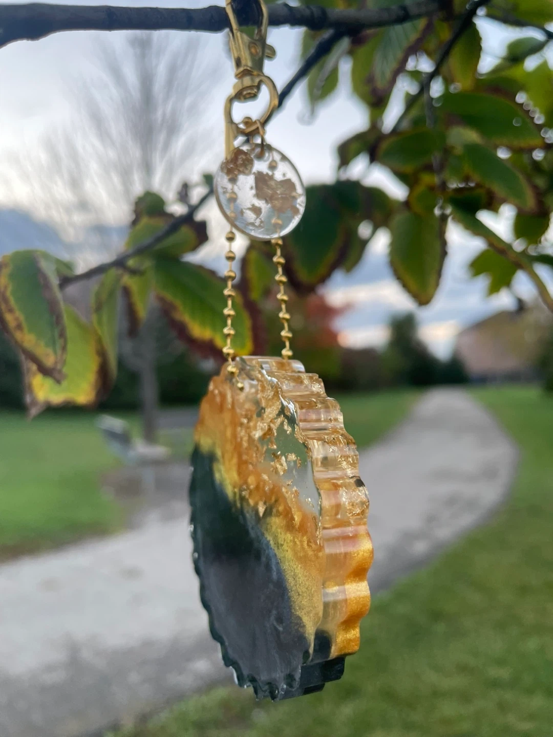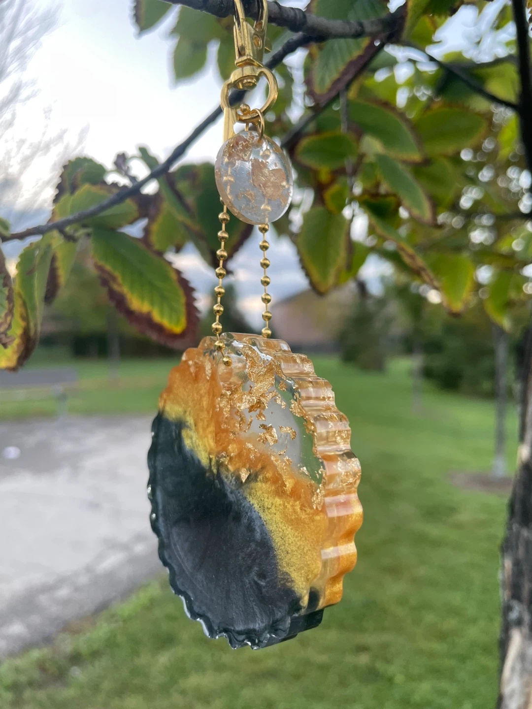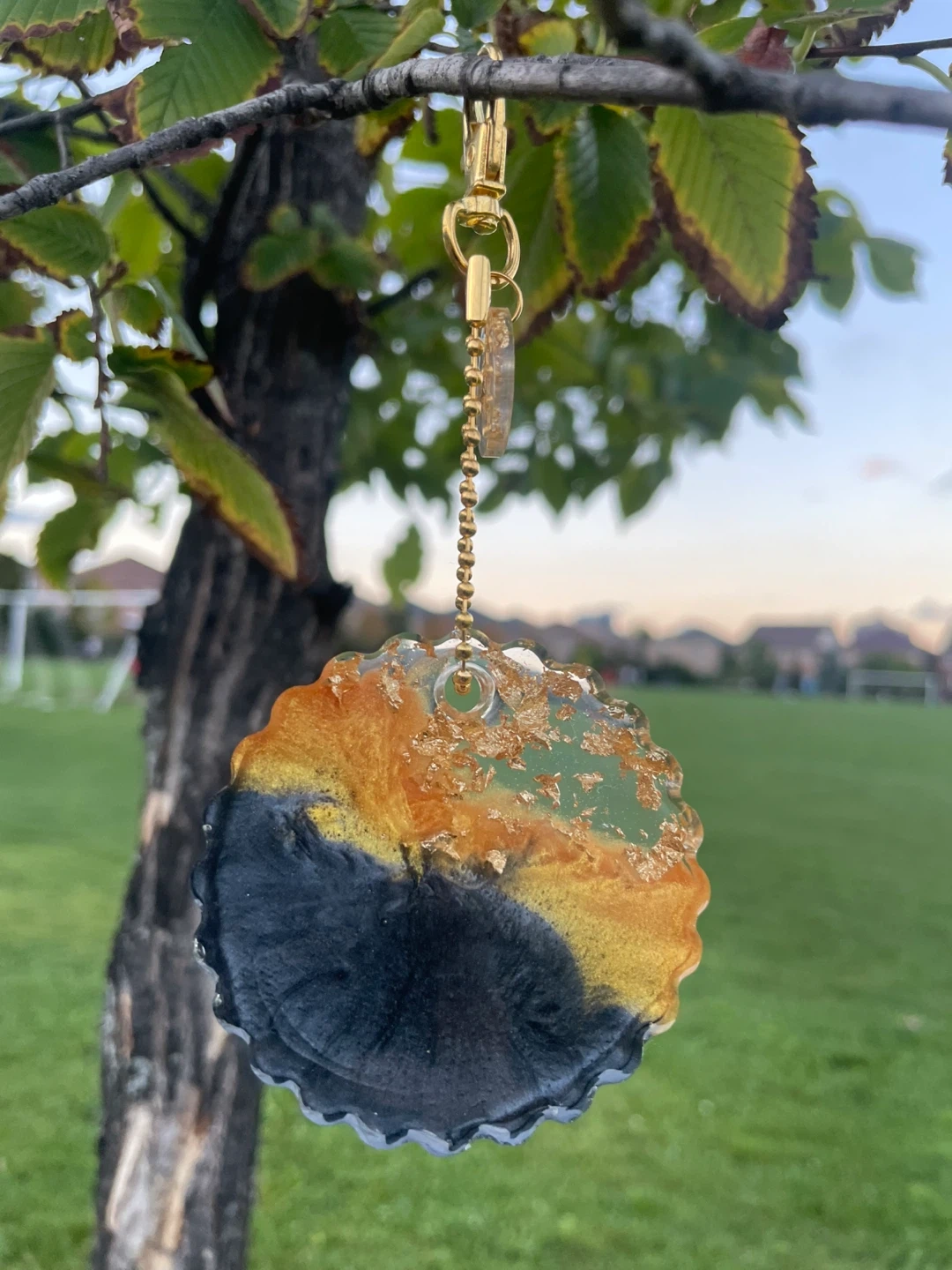 34Here's a handmade resin keychain featuring a beautiful gold and black design! It would look great on your keys or bag