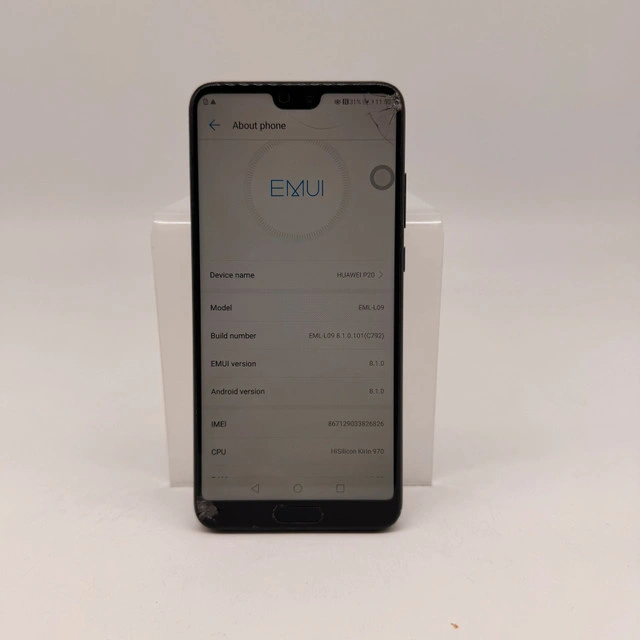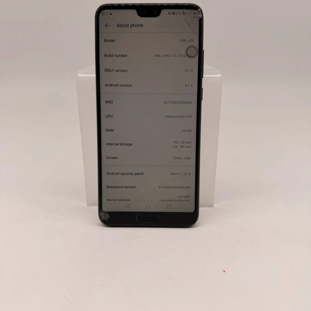 This is a Huawei P20 (EML-L09) smartphone in black. Storage: 128 GB, RAM: 4 GB, CPU: HiSilicon Kirin 970, Screen: 5.8” Full HD+ (2244 × 1080), Dual Leica rear cameras, OS: Android 8.1 with EMUI 8.1. Phone powers on and works. Condition: Screen is damaged/cracked and has cosmetic wear (see photos). Despite the damage, it is still functional. Includes phone only (no charger or accessories).