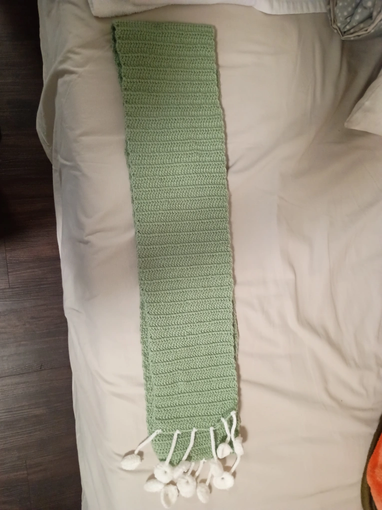 Selling a cozy, handmade crochet scarf in a lovely green colour. It's got some cute white accents. Perfect for keeping warm on chilly days!
