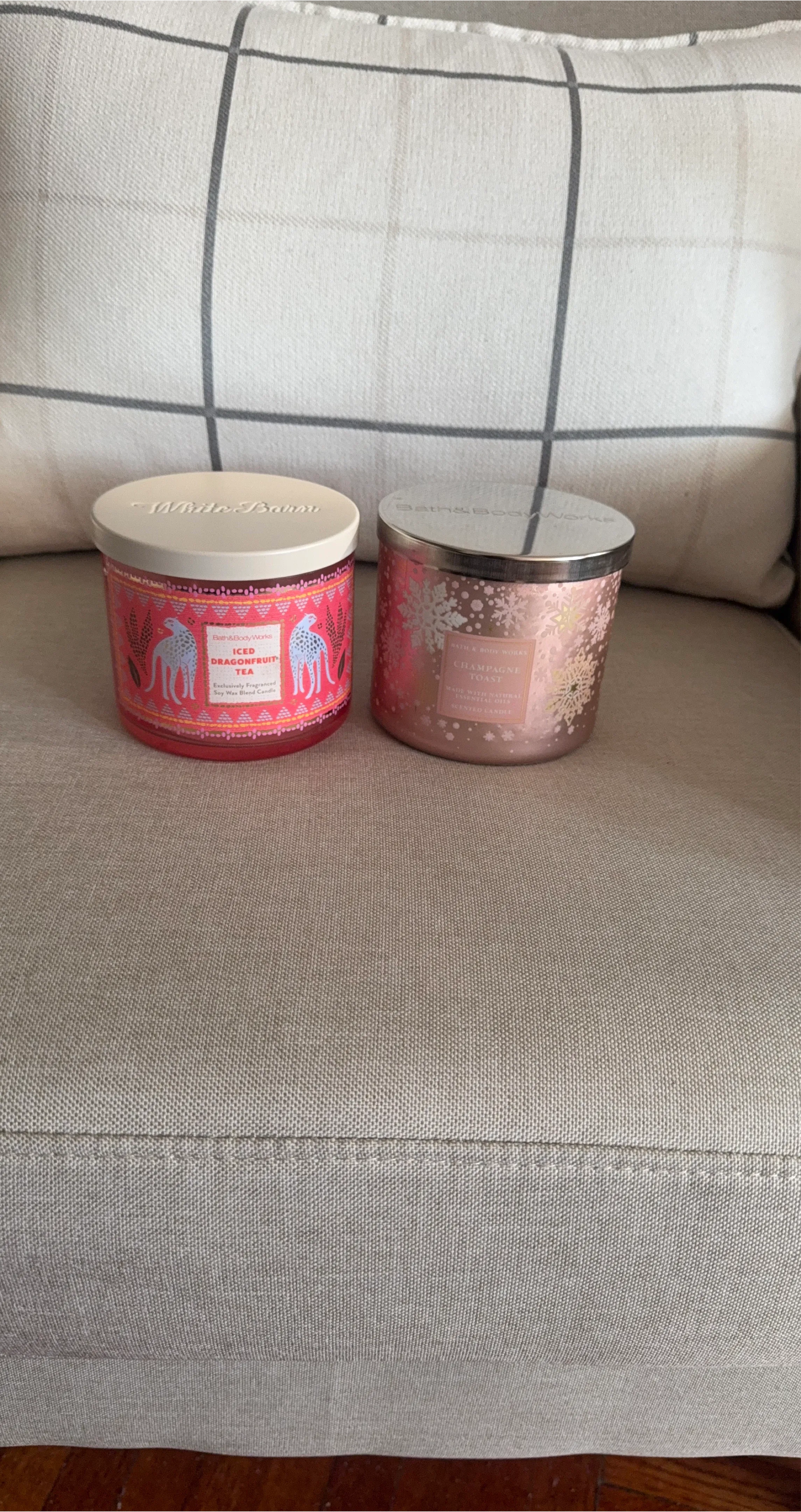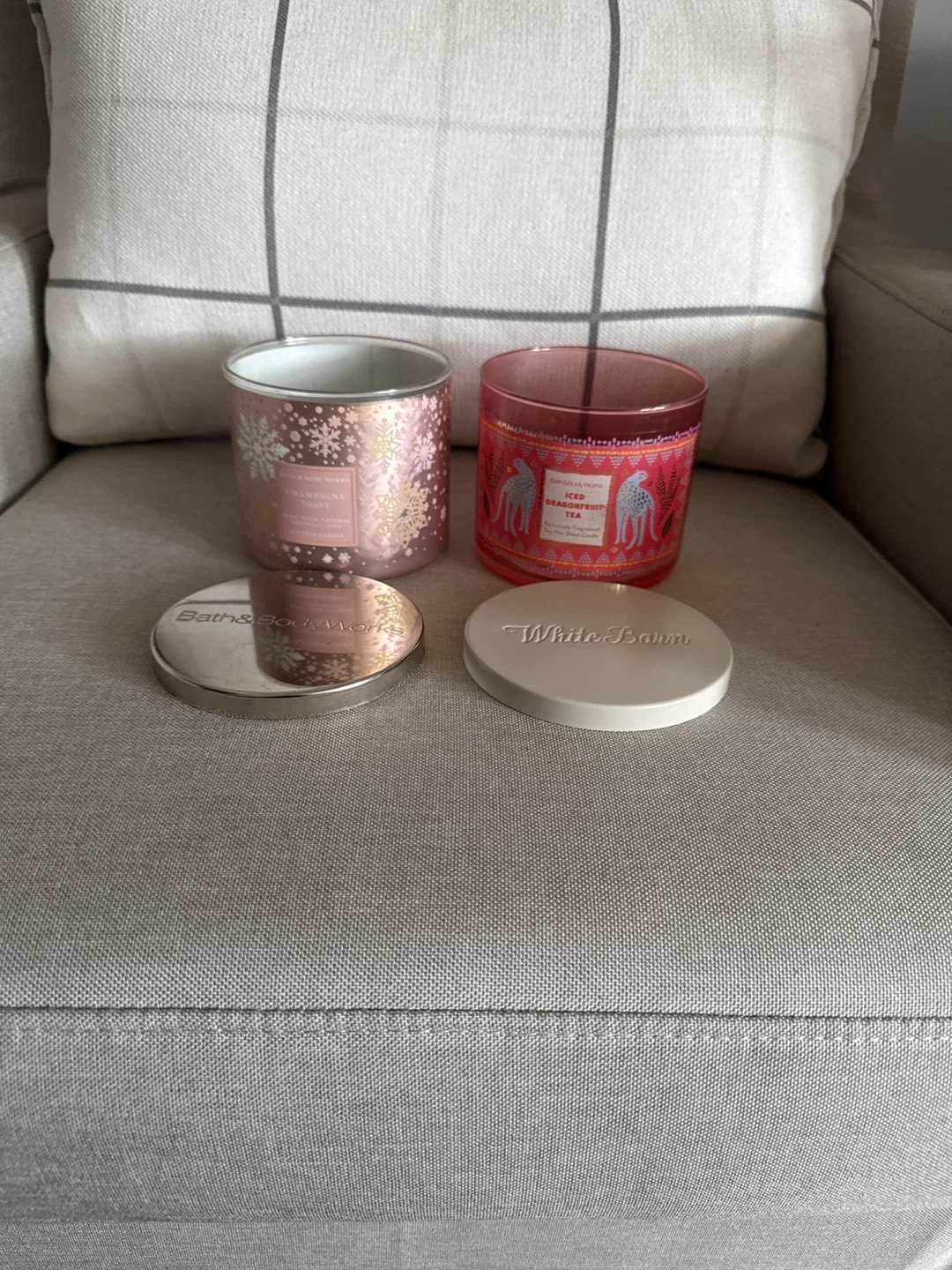 Gifting two Bath & Body Works empty candle jars. One is Iced Dragonfruit Tea, and the other is Champagne Toast. Jars are empty but maintain the fragrance of the original wax candle, and can be repurposed for just about anything.