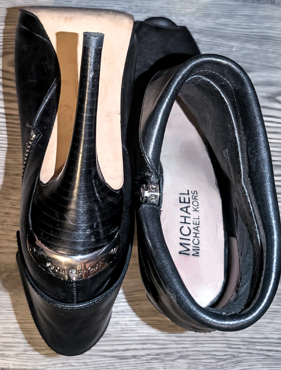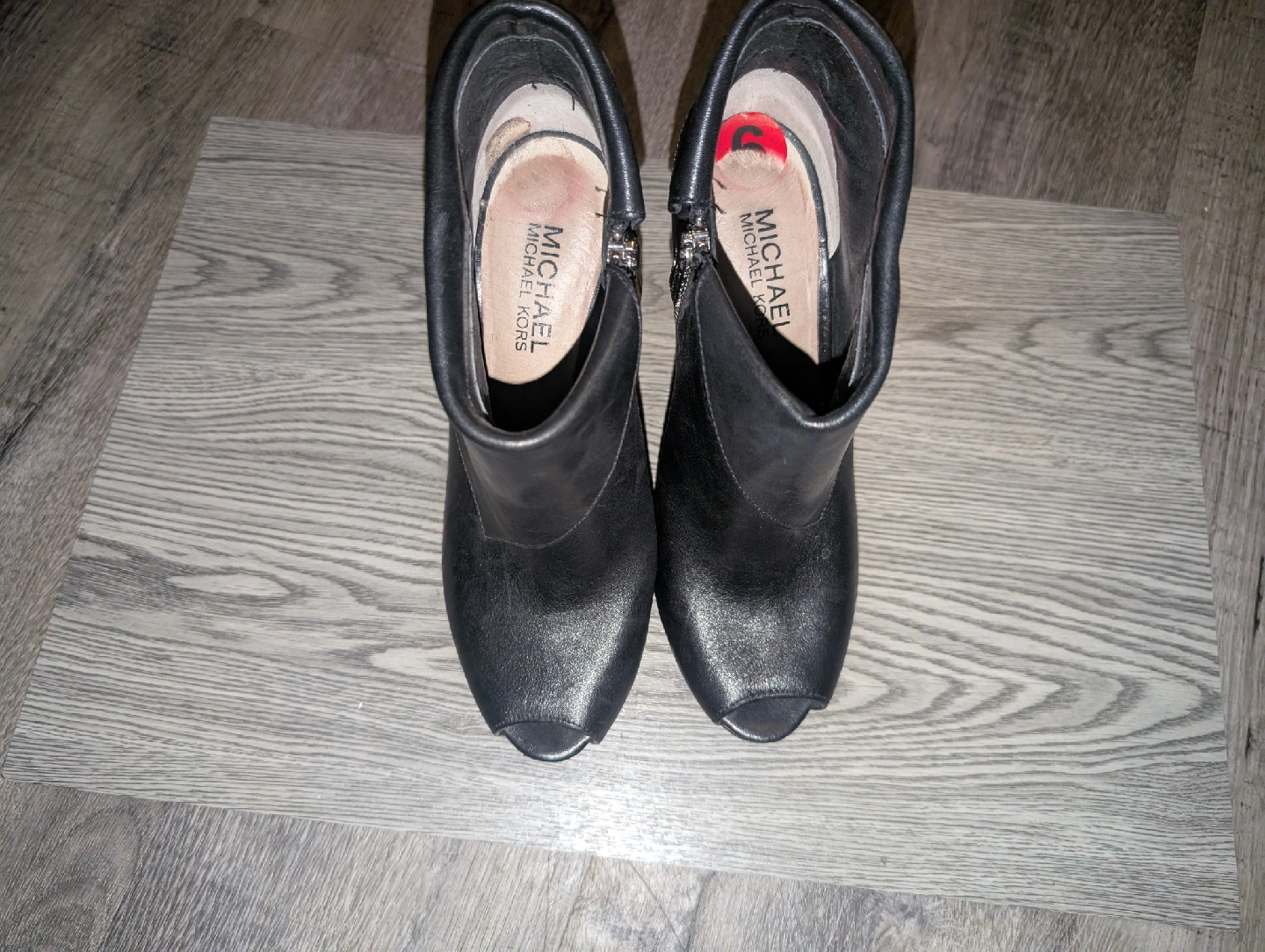 Stylish black leather heels from Michael Kors! They are size 6 and would be a great addition to your wardrobe. They feature a sleek design with a peep toe and a zipper accent.