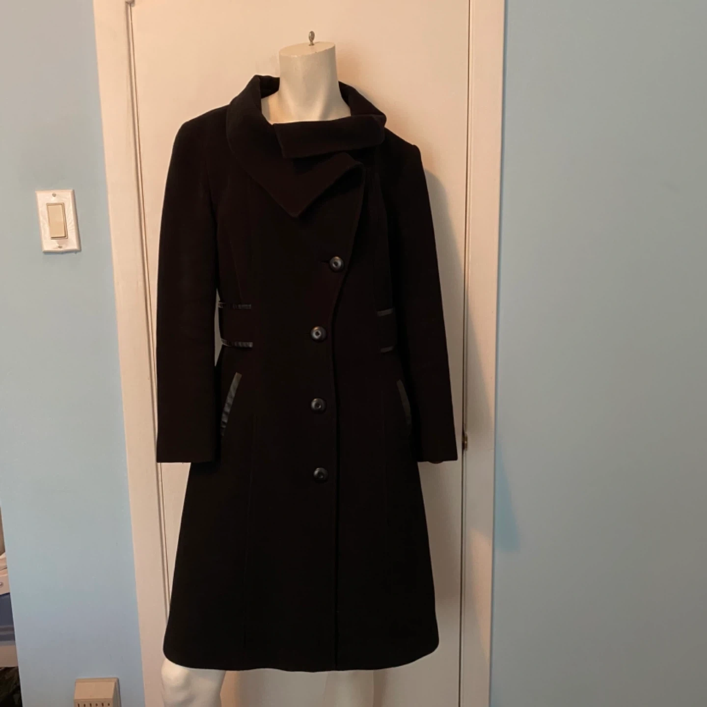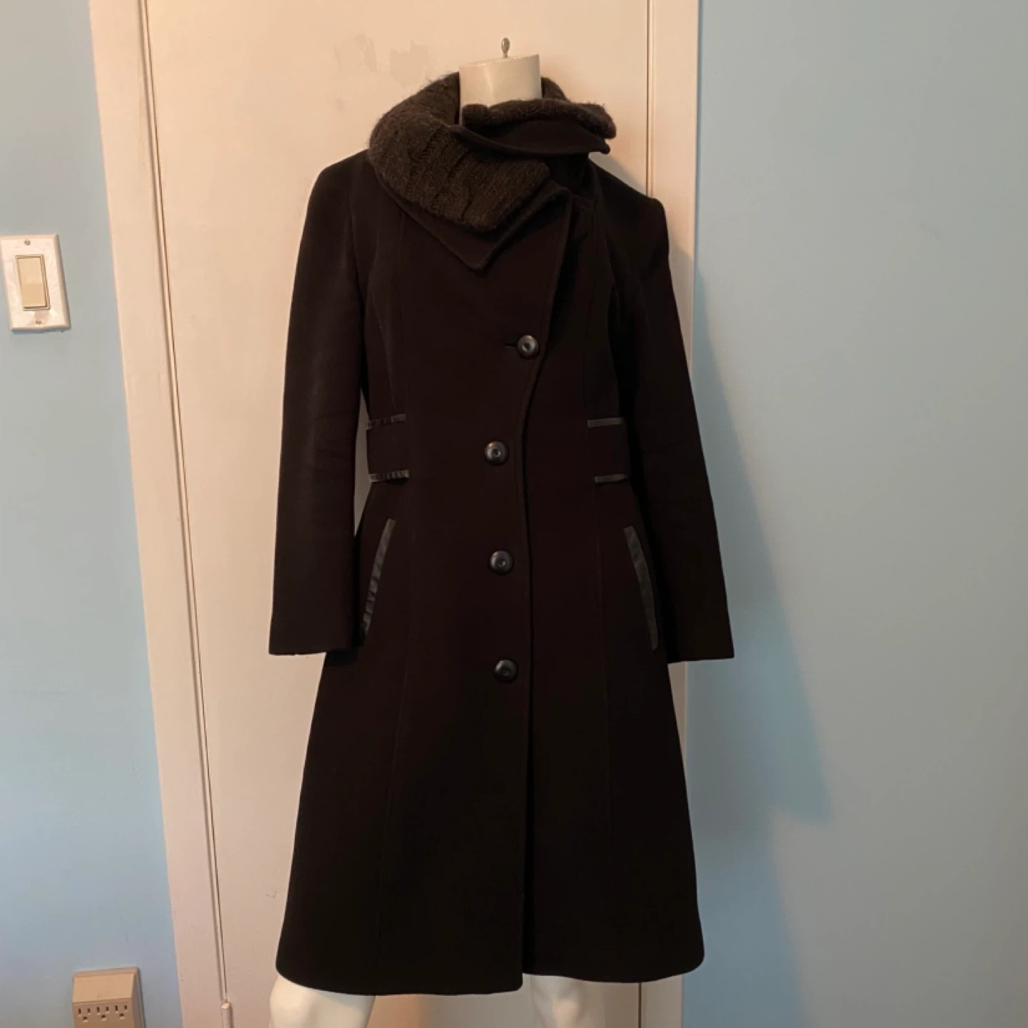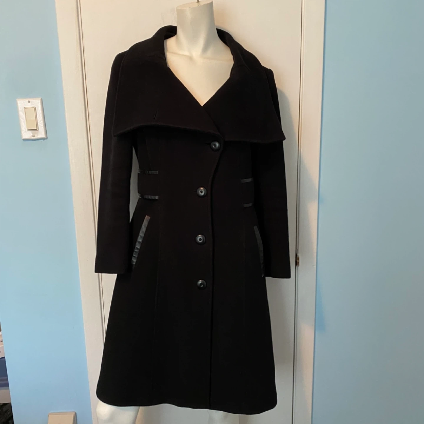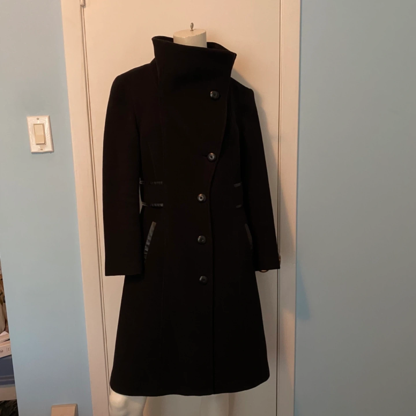 76This luxurious Mackage coat is crafted from a soft wool-cashmere blend and designed with a timeless A-line silhouette. The coat features a removable scarf and versatile waterfall collar that can be styled in multiple ways—up, folded, or draped—for 6 different looks. Details you’ll love: - Premium wool-cashmere blend for warmth and elegance - Leather trim detailing on the belt, pockets, and loops - Attached belt to cinch the waist and flatter your figure - Beautiful leather welted pockets for a sleek finish - Removable scarf for added versatility 📏 Sizing Note: The tag reads Large, but the coat was professionally tailored at Holt Renfrew to fit more like a Medium. Please refer to Mackage’s official sizing dimensions (screenshot provided in listing) to ensure the best fit. This is a show-stopping coat that combines sophistication, craftsmanship, and functionality—perfect for both everyday wear and special occasions. 💫 Excellent condition