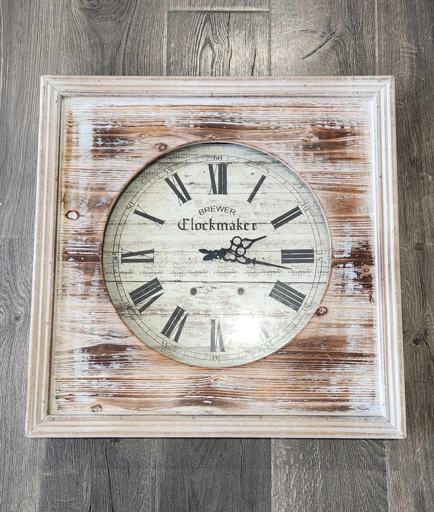 Selling a Brewer Clockmaker wall clock. It has a rustic, farmhouse style with a distressed wood frame and Roman numerals. It's a great decorative piece for any room!