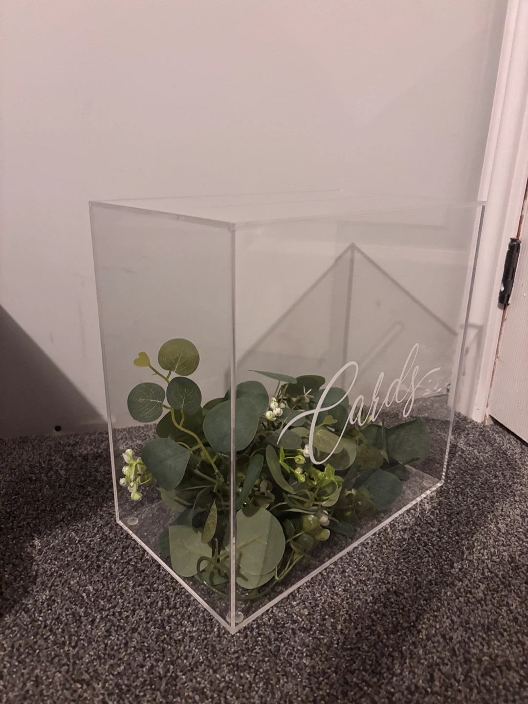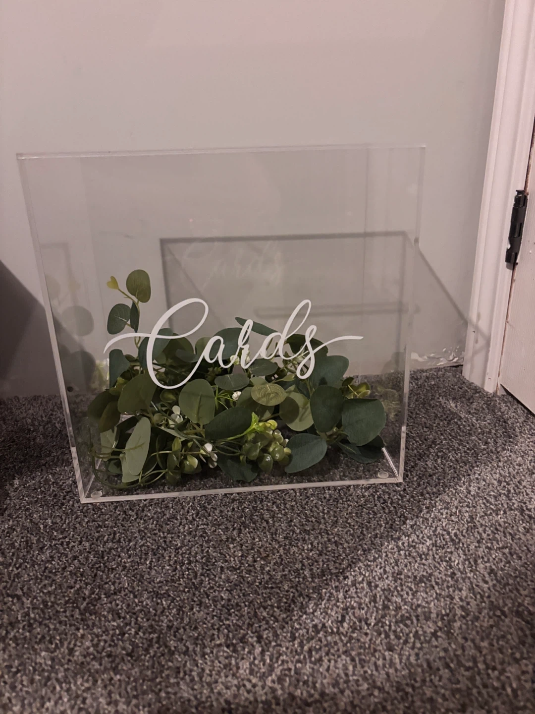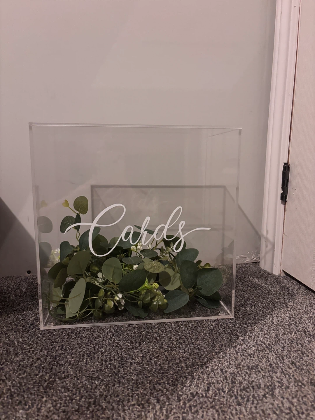 15Selling a clear acrylic card box, perfect for weddings or other special events! It has a slot on top for cards and currently has some faux greenery inside, which can easily be removed to match your decor