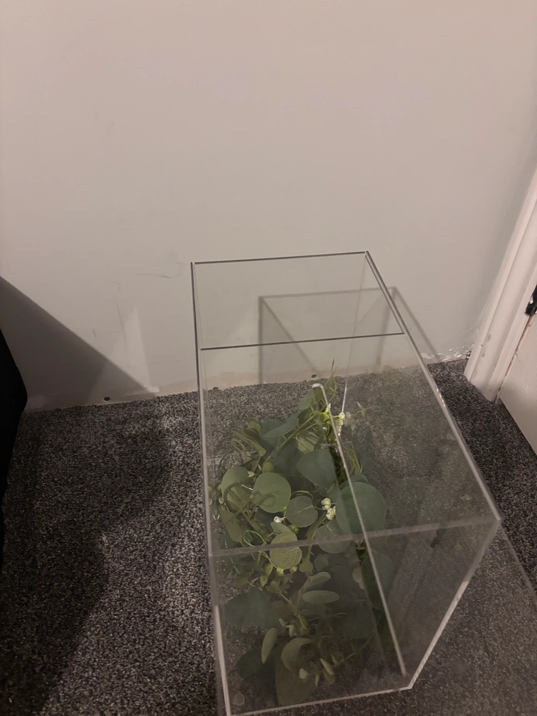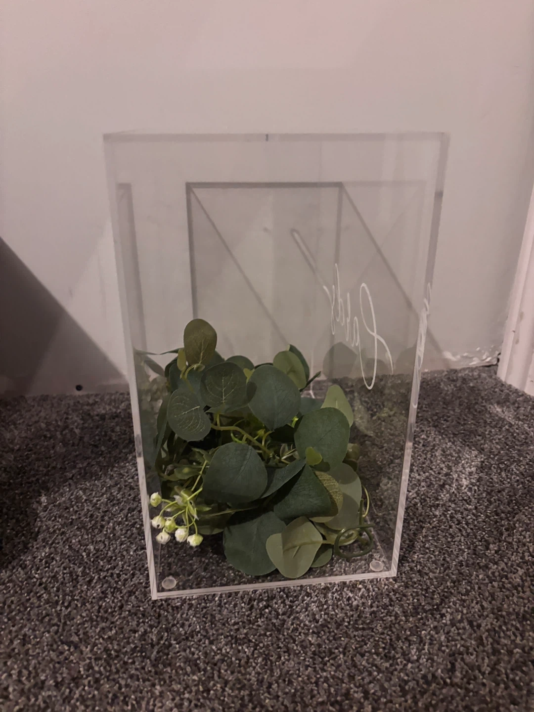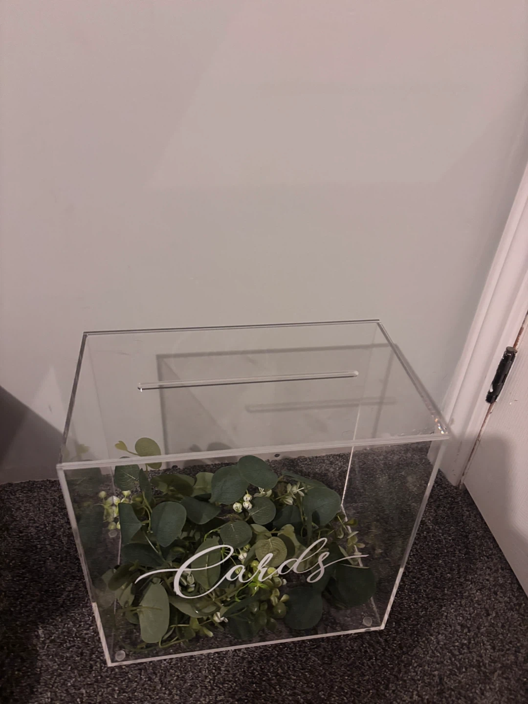 15Selling a clear acrylic card box, perfect for weddings or other special events! It has a slot on top for cards and currently has some faux greenery inside, which can easily be removed to match your decor