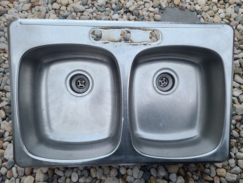 Here's a double basin stainless steel sink. It shows some signs of use, as seen in the photos. Perfect for a kitchen or utility room!