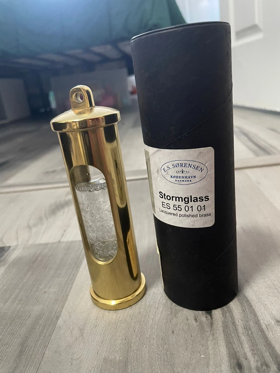 Selling a beautiful E.S. Sørensen Stormglass. The model number is ES 55 01 01. It's made of lacquered polished brass and comes with the original box!