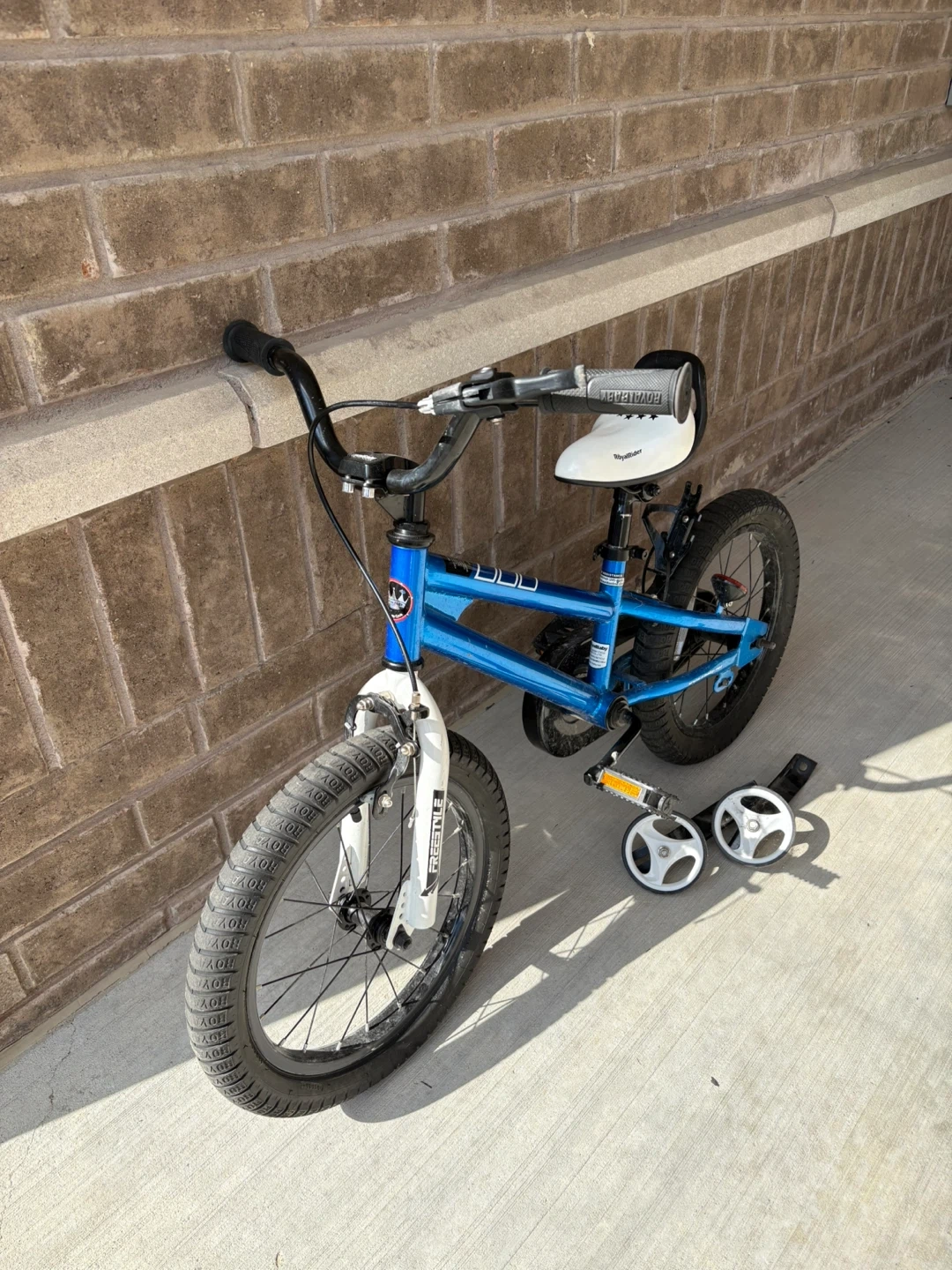 Selling a RoyalBaby 16 kids bike in blue! It's a great bike for learning to ride. It comes with training wheels that can be easily attached or removed. The bike is in good condition and ready for a new rider