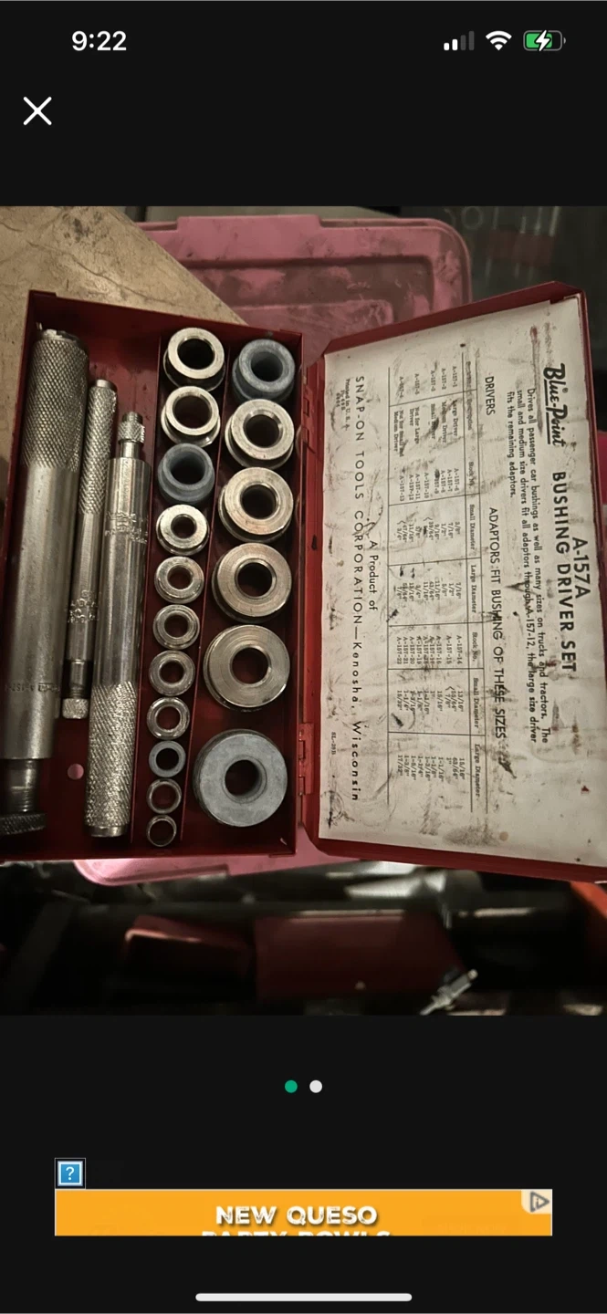 Selling a Snap-on Tools A-157A Bushing Driver Set. It comes in a red metal box with various drivers and adaptors. The set includes a Blue-Point bushing driver set. Perfect for any mechanic or DIY enthusiast!