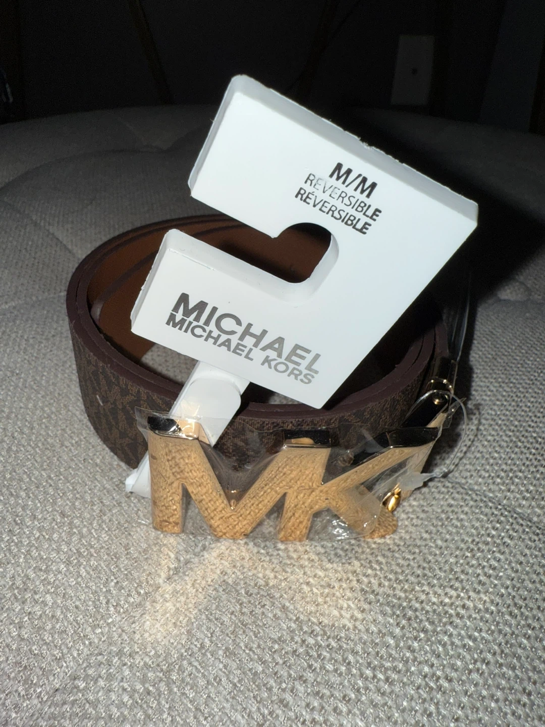 This is a brand new Michael Kors reversible belt, size M/M. It's brown on one side and black on the other, so it's super versatile! The buckle has the classic MK logo. Originally bought for $98