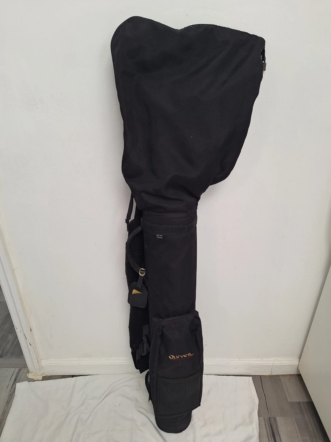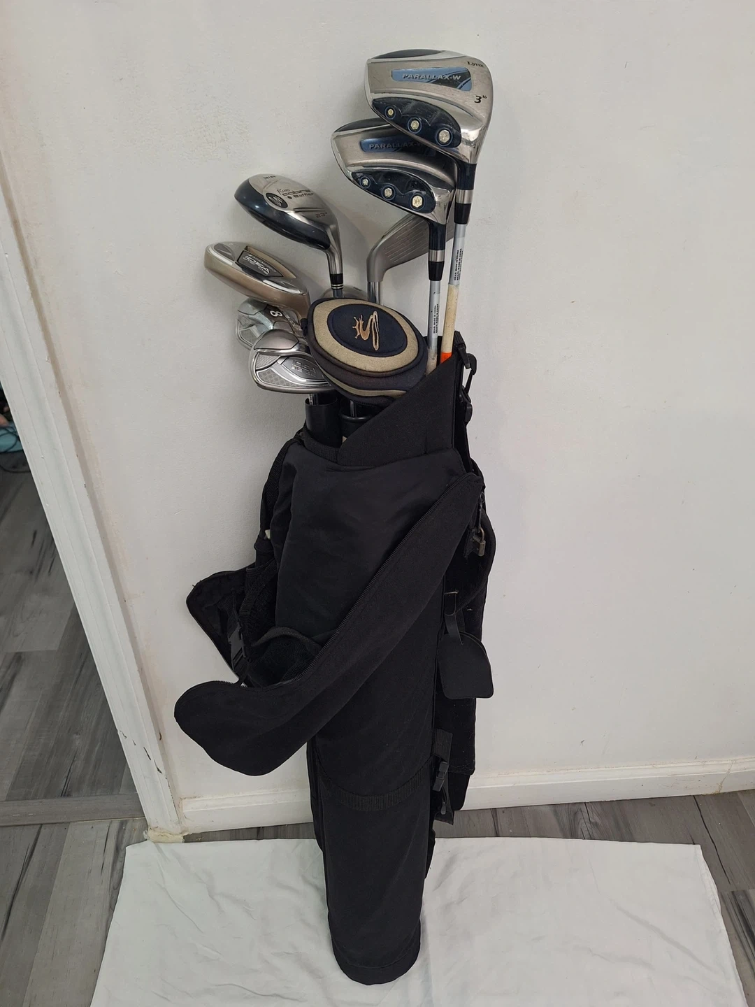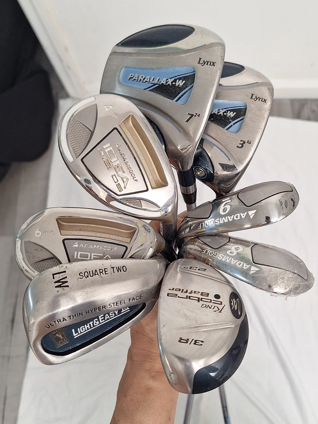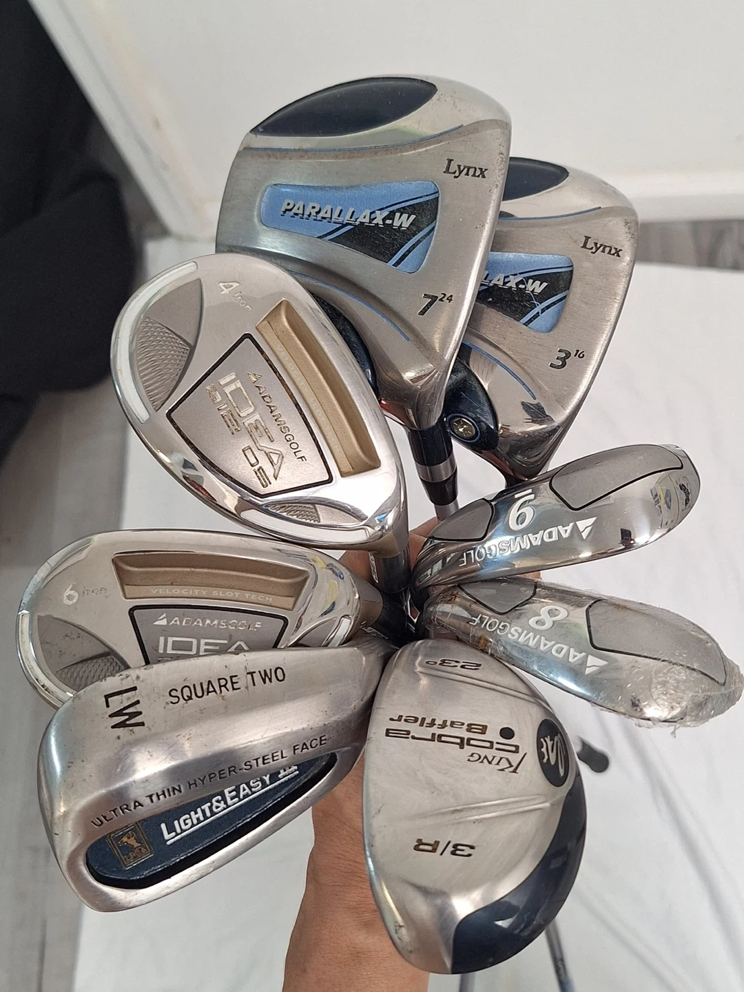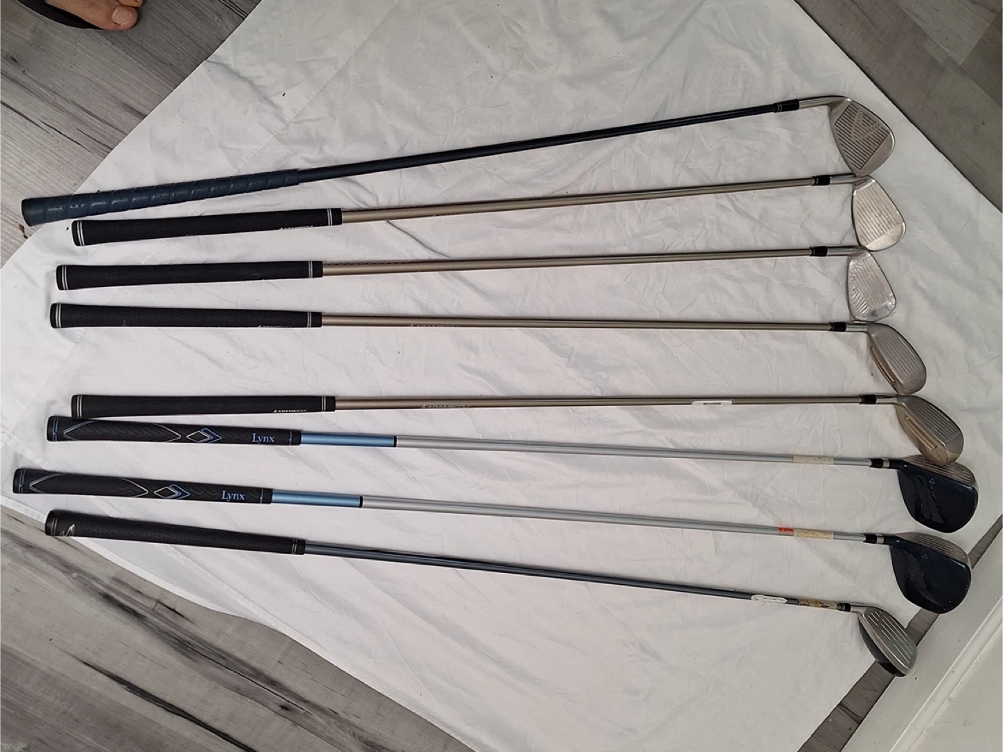 Selling a set of golf clubs including brands like Lynx, Adams Golf, and Cobra. Comes with a black Quiver golf bag to keep them organized and protected.
